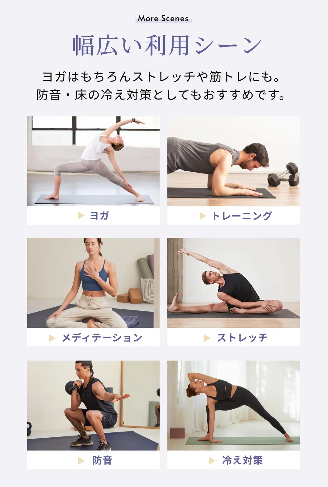 [高品質マット]アスリート向け、持ち運びができるヨガマット。丈夫で軽量なマットは、ヨガだけでなくウエイトトレーニングやストレッチ等すべてのフロアエクササイズに対応します。