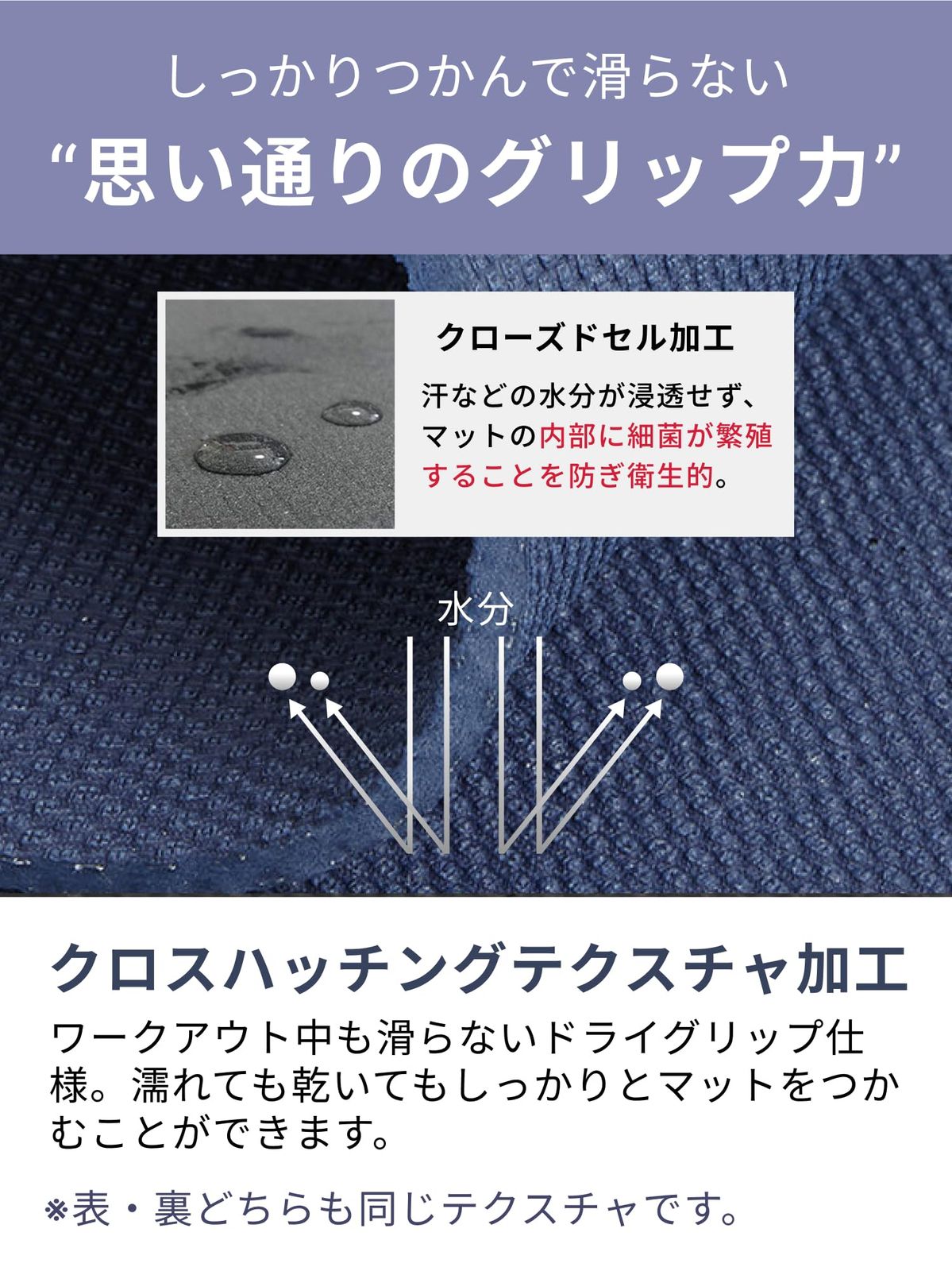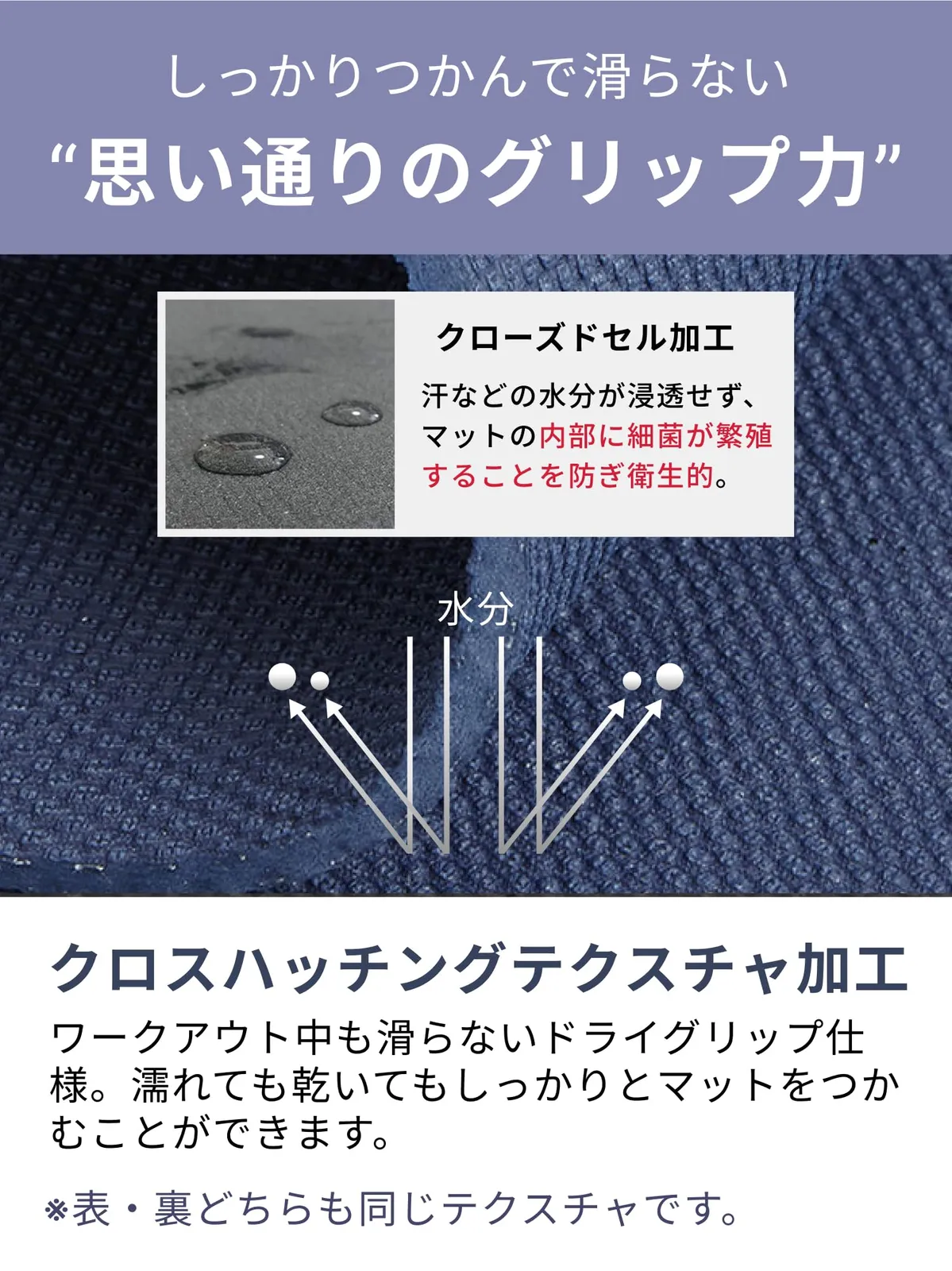 [クローズドセル構造]汗などの水分が浸透しにくい素材を採用。マット内での細菌繁殖を防ぐので、衛生的で快適な使い心地が保たれます。