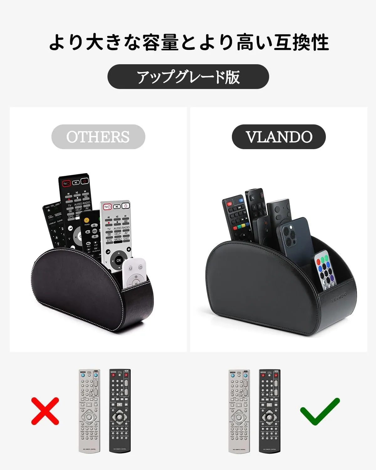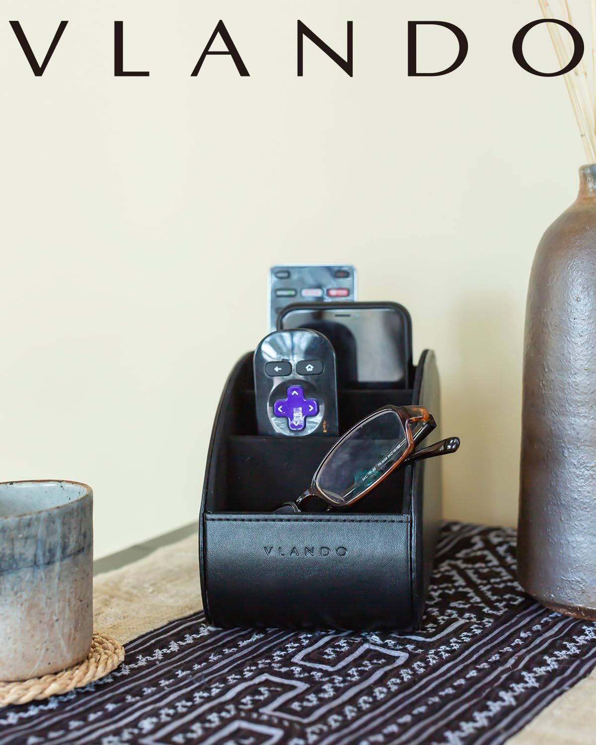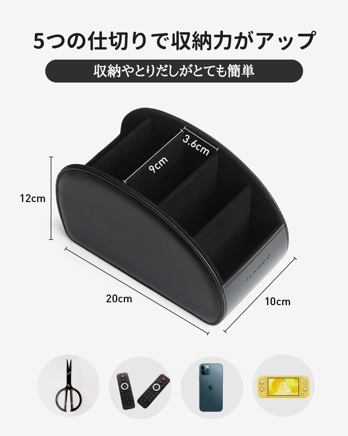 Vlandoリモコンラック PUレザー 大きいサイズ リモコン収納 テーブル 5格仕切り リモコンスタンド おしゃれ 防水 多機能収納ボックス 大容量 文房具 卓上小物 ブラック