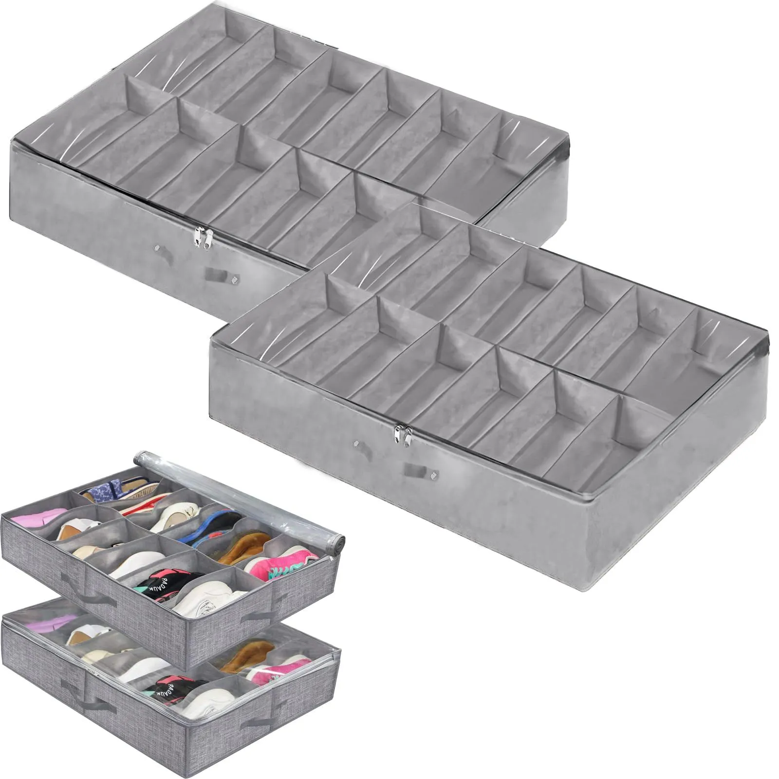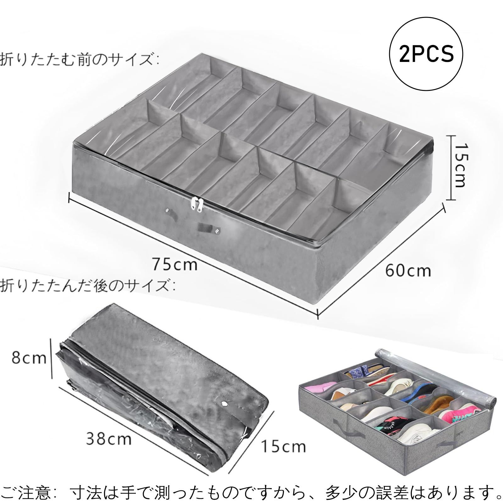 ベッド下収納ボックス 2個セット シューズボックス 12仕切り ベッド下靴収納オーガナイザー ベッド下靴収納ケース シューズ収納バッグ ベッド下収納 シューズ収納バッグ 靴箱 下駄箱 収納ケース 収納ボックス 衣装ケース 不織布製 折り畳み 透明蓋付き 持ち手付き 大容量 積み重ね可能 省スペース 防塵 通気 耐久性 衣類/寝具/毛布/靴/おもちゃ/本/布団 収納 (グレー)