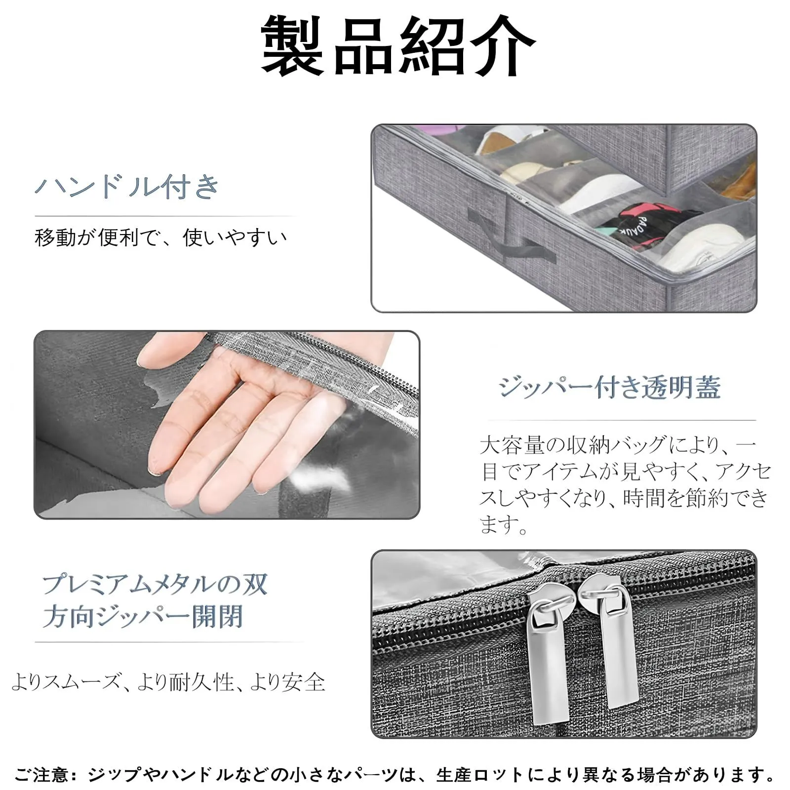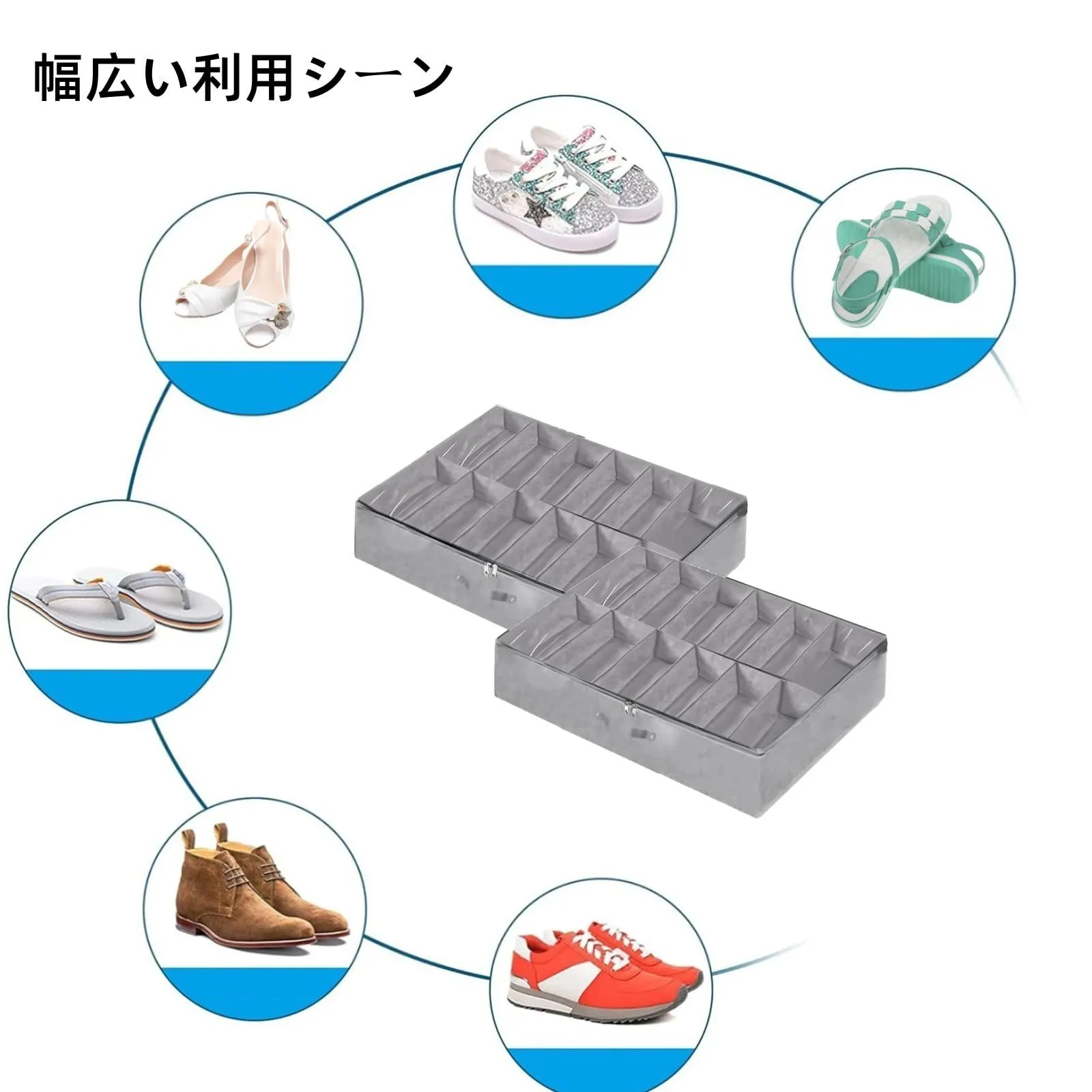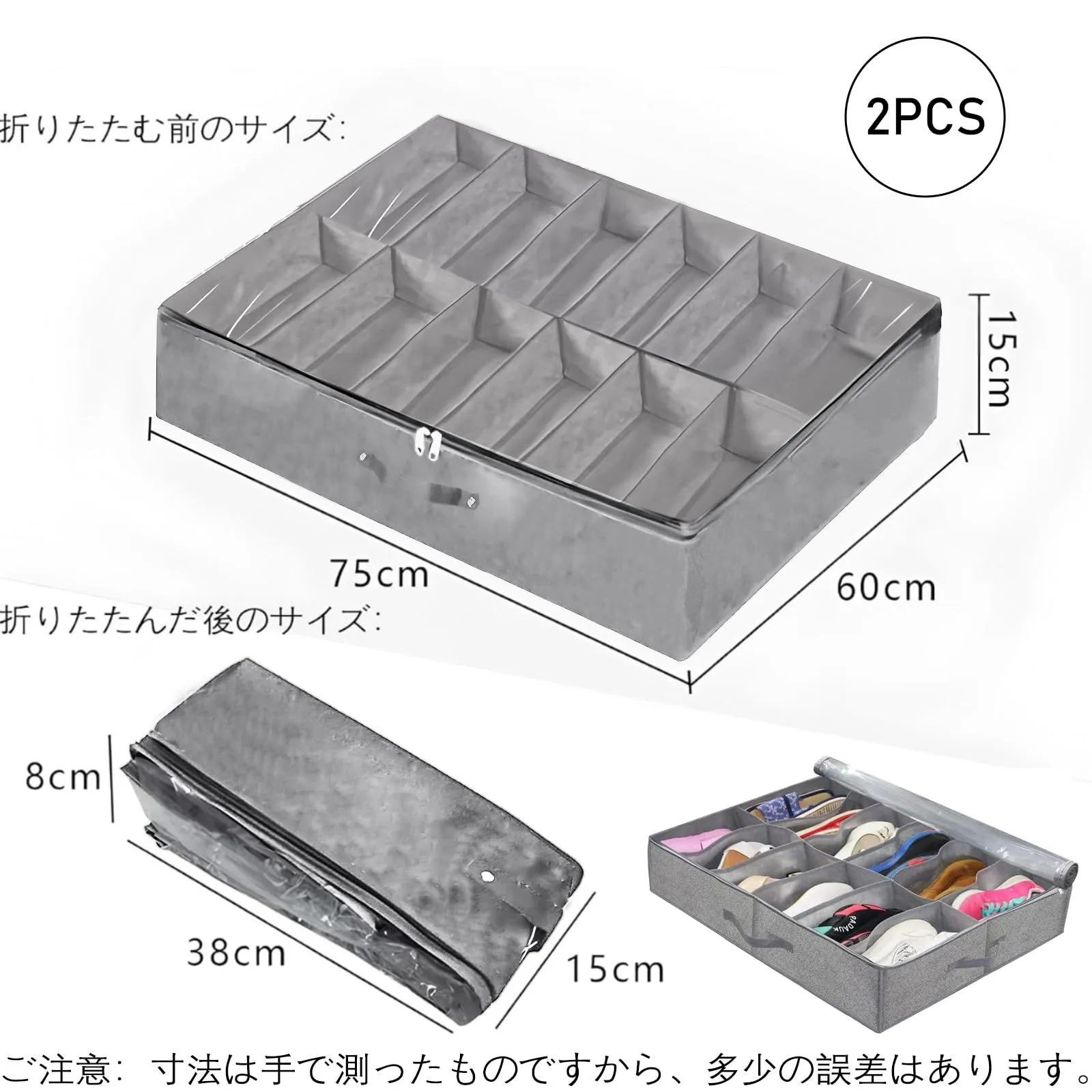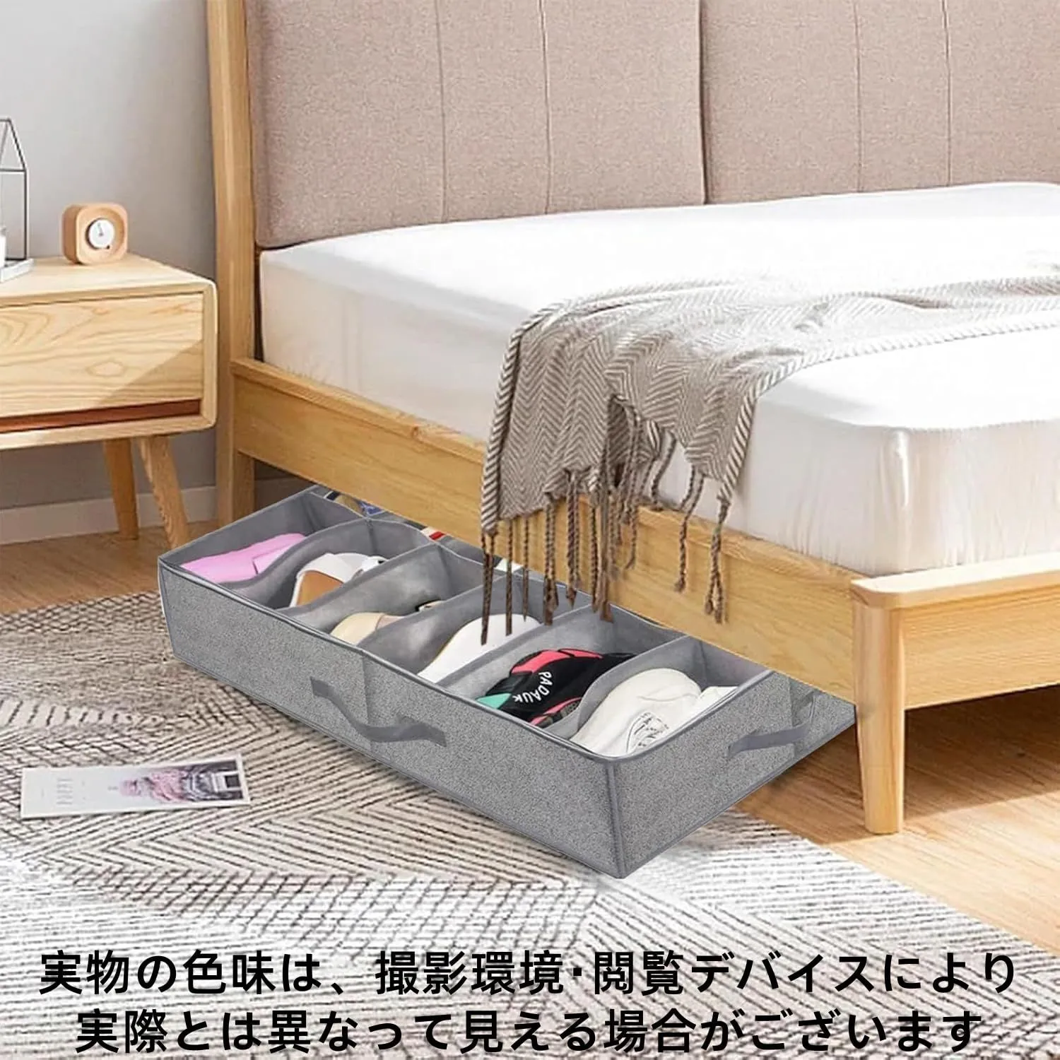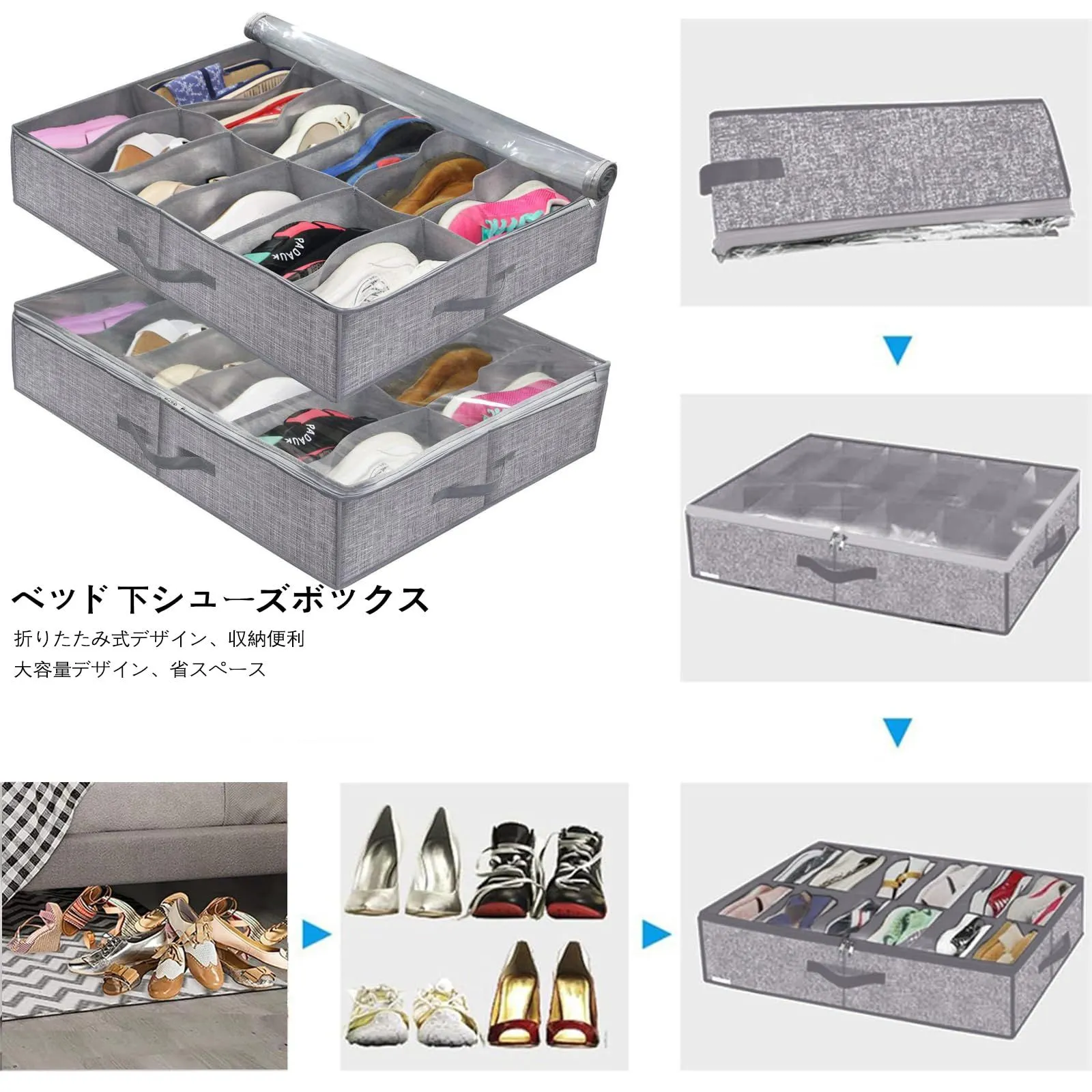 折りたたみ式デザイン:当社のベッド下収納ボックスは薄型デザイン(高さ約15cm)で、標準的なベッドフレームの隙間にすっきりと収納できます。コンパクトなサイズながら、1箱に約12足の靴を収納できるので、リビングや寝室の床が散らかる心配もありません。折りたたみ式の収納ボックスなので、使わないときは折りたたんで収納でき、場所をとりません。