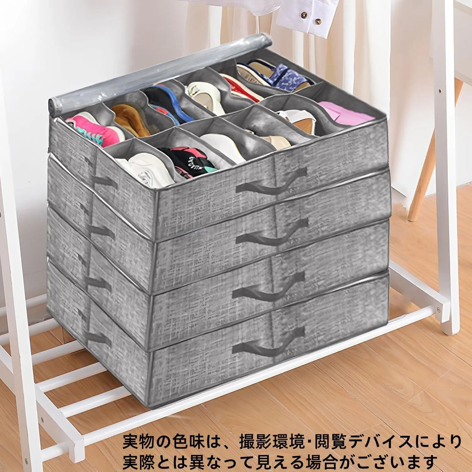 多機能デザイン: シューズオーガナイザーとしてだけでなく、様々な収納シーンで活躍します。カバー付きのデザインはホコリが入りにくく、普段使わない季節物(冬のブーツや夏のサンダルなど)の収納に最適です。また、衣類・寝具・雑貨の整理にも使え、子供のおもちゃ入れ、本の整理、布団の収納など、用途に合わせて自由に使えます。