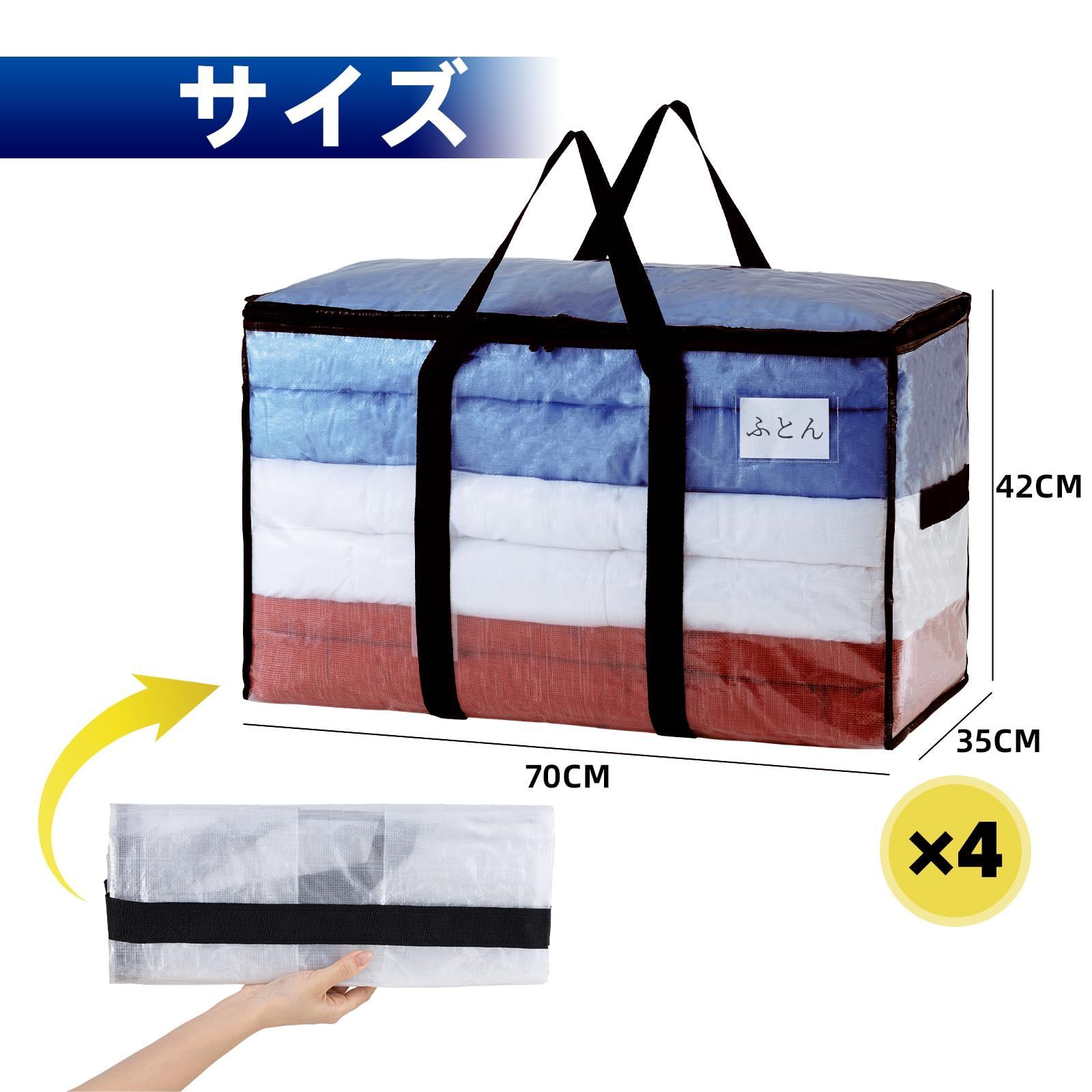 100L大容量、収納力抜群:抜群な特大引越しバッグの寸法:70 cm 35 cm 42 cm、4 パック。 両端のジッパーと中央に大きな開口部があるため、衣類、おもちゃ、靴、タオル、必需品、枕、寝具、シーツ、毛布、洗濯物、クリスマス飾りなどを簡単に収納できます