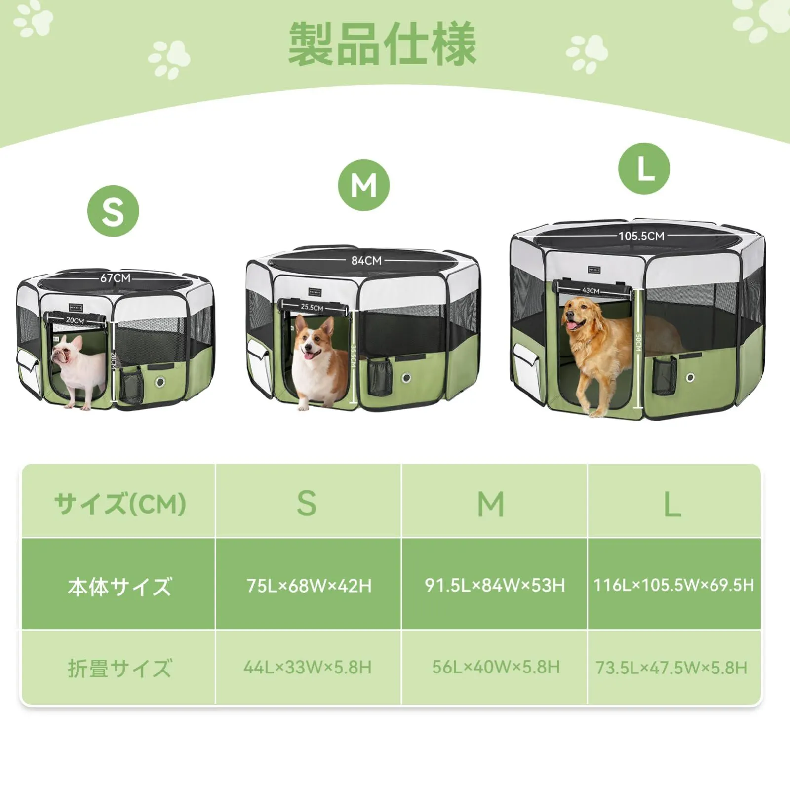 【M・Lサイズ展開・大型犬にも対応】ペットサークルのMサイズは小型犬・猫に最適。Lサイズのサークルを高く設計し、高さと広さに余裕があり、落ち着いた大型犬や多頭飼いにも対応します。圧迫感の少ない八角形デザインで、ペットが自然にくつろげる空間を確保。さらに、ペットサークルは特に静かでプライベートな空間を必要とする「出産前後の一時スペース」としてもご活用いただけます。