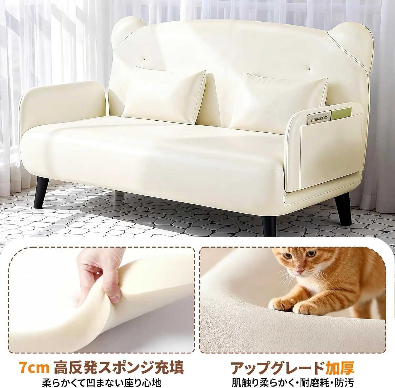 猫スクラッチレザー採用 - ペットの爪研ぎにも強い特殊スクラッチクロス素材。ほつれにくく美観を長持ち、汚れやホコリも付きにくい