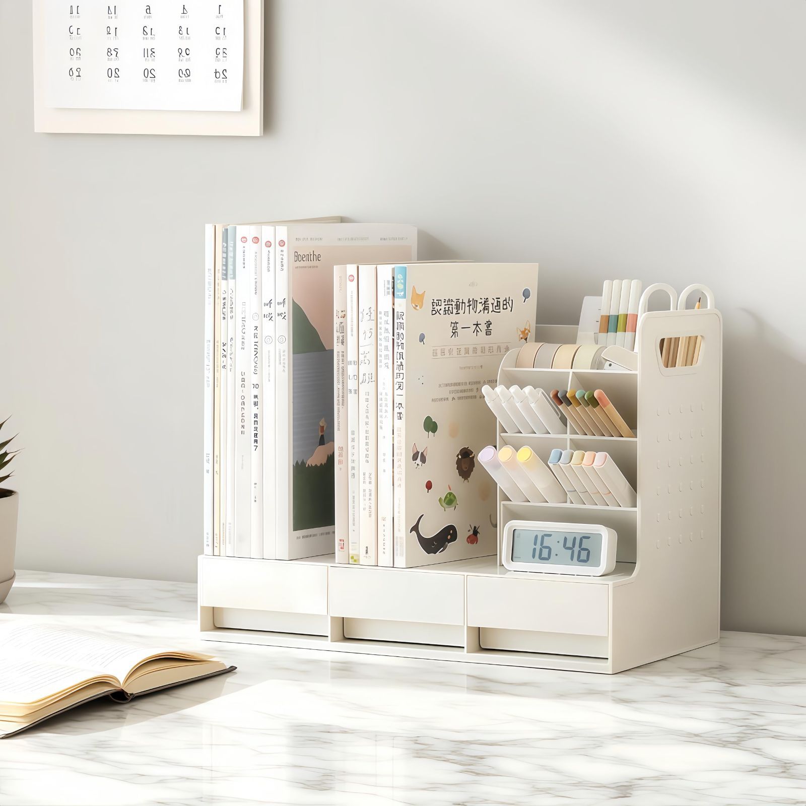 【超大容量!空間革命】デスクシェルフはコンパクト設計でありながら、驚きの大容量!本や雑貨がたっぷり収まる大型オープン収納スペースを3箇所、さらに小物収納に便利な小さな引き出しを3つ(底部) を備えています。縦型デザインで死角を解消、限られたスペースを最大限に活用し、すっきり快適な環境を実現します。
