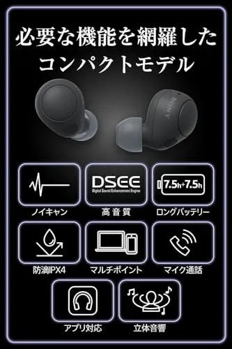 "ノイズキャンセリングON時は本体最長7.5時間、ケース充電込で合計最長15時間(*1)使用出来ます。また、10分充電で60分再生可能(*2)のクイック充電にも対応。さらにIPX4の防滴性能(*3)も搭載し、突然の雨や汗でも問題なく使用できます。 *1 完全ワイヤレスモデルはケース充電を含む。コーデックはAAC。DSEE/イコライザーの搭載モデルはOFF設定時、またその他機能は全て初期設定時 *2 コーデックはAAC、ノイズキャンセリング機能ON時、DSEE /イコライザー搭載モデルはOFF設定時、またその他機能は全て初期設定時 *3 ケースを除くヘッドホン本体のみ。あらゆる方向からの飛沫に対して本体機能を保護するものです。本機の音導管(音出口の筒部)、通気孔、マイク穴を除く"
