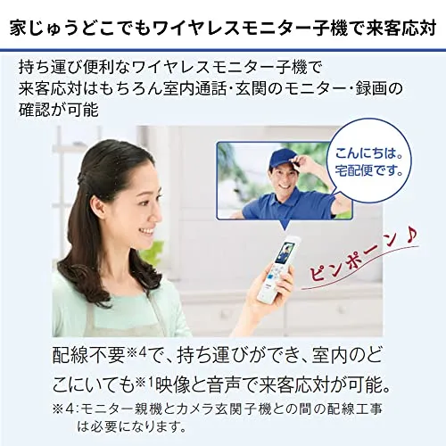 【特徴】シンプルタイプの家じゅう「どこでもドアホン」です。家じゅうどこにいてもワイヤレスモニター子機で来客応対ができます。持ち運び便利なワイヤレスモニター子機で来客応対はもちろん室内通話・玄関のモニター・録画の確認も出来ます。玄関子機には夜でも来訪者の顔が見える、 LEDライト搭載です。夜間に玄関子機の「呼出ボタン