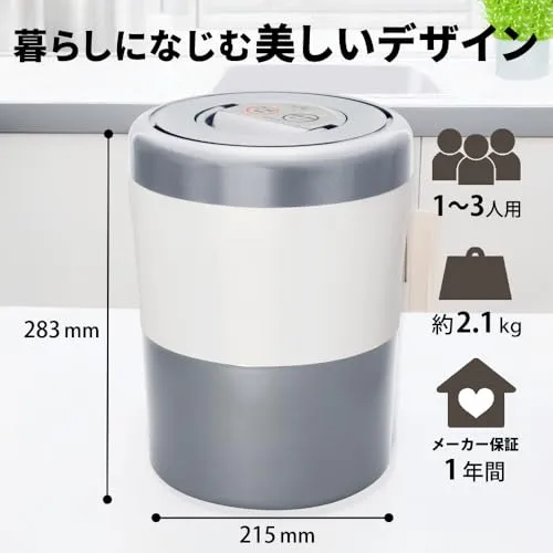 【コンパクトサイズ・省スペース】本体サイズ:直径215高さ283mm、質量約2.1kg。キッチンカウンターや棚に置きやすいコンパクト生ゴミ処理機で、省スペース設置が可能。
