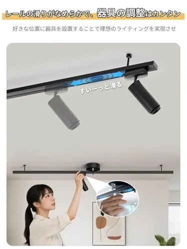 『超薄型デザイン 安定感を保ち』 このライティングレールは、天井から圧迫感がなく、狭い空間でも広々と感じさせます。さらに、両端に調整ネジがついており、安定感を保ちながらライトレールが揺れる心配もありません。