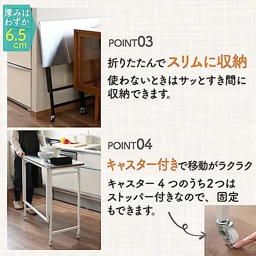 【コンパクトに折りたためる】折りたたむと約6.5cmとスリムになるので、使わないときはすき間に収納できるキッチンカウンターです。コンパクトなので出したり閉まったりしやすいです。