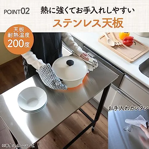 【熱に強いステンレス天板】天板はお手入れカンタンなステンレス製で、耐熱温度200度と熱にも強い仕様です。※天板四隅に埋まっているパーツは耐熱性ではありませんので熱い鍋等が直接あたらないようにご注意ください。