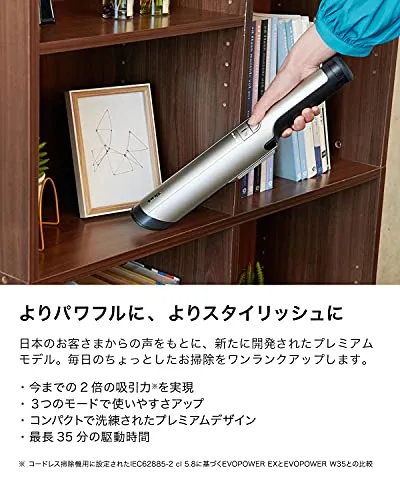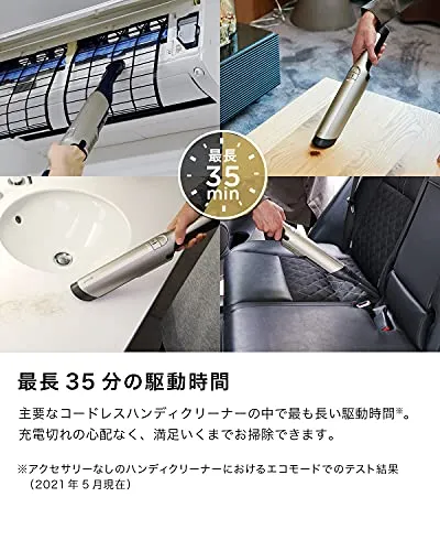 最長35分の駆動時間:主要なコードレスハンディクリーナーの中で最も長い駆動時間*。 充電切れの心配なく、満足いくまでお掃除できます。 *アクセサリーなしのハンディクリーナーにおけるエコモードでのテスト結果 (2021年5月現在)