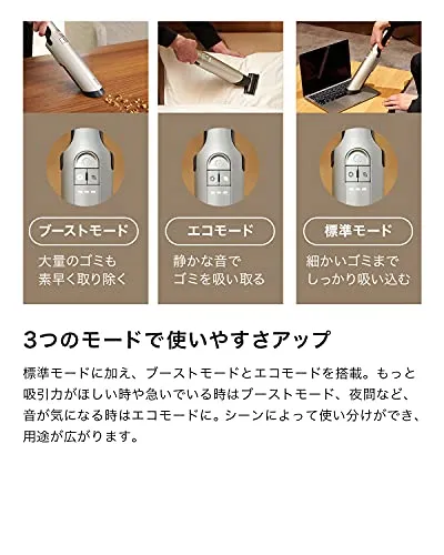 3つのモードで使いやすさアップ:標準モードに加え、ブーストモードとエコモードを搭載。もっと吸引力がほしい時や急いでいる時はブーストモード、夜間など、音が気になる時はエコモードに。シーンによって使い分けができ、用途が広がります。