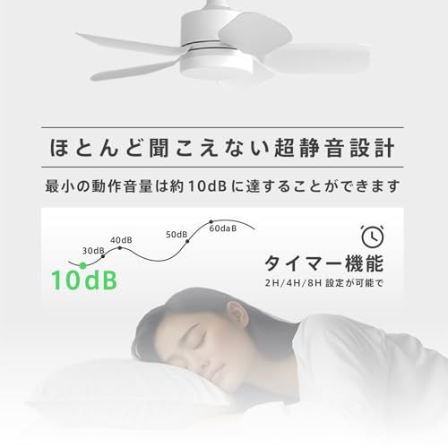 【6段階風調節&タイマー機能】小型シーリングファンライトは、「弱風」、「中風」、「強風」などの6段階の風量調整モードを備えています。これにより、従来の人工的で硬い風ではなく、身体をやさしく包み、森の中にいるかのような爽快感を味わえます。夏の暑さを忘れて、心も体もリフレッシュできます。また、タイマー機能とメモリ機能も搭載されています。シーリングファンライトの裏側には3500K電球色10%輝度の雰囲気ランプがあり、間接照明として利用できます。2H/4H/8H設定が可能で、設定時間が経過すると、LEDとファンの電源が自動で切れます。メモリ機能により、オフする直前の状態が再現されるため、個人や家族の好みや日常的なニーズに対応可能です