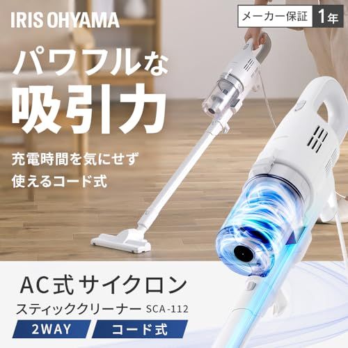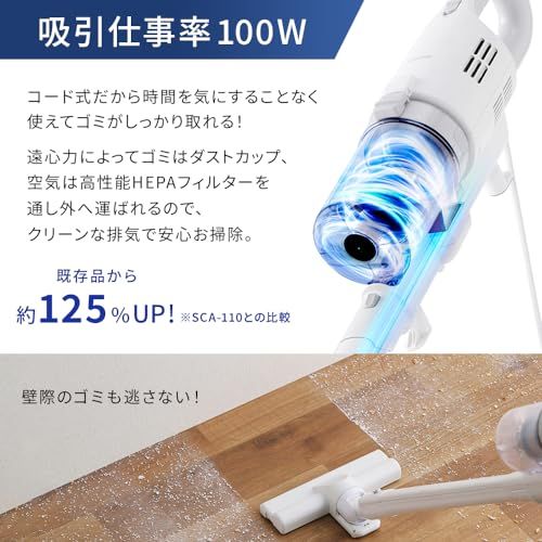 【パワフルな吸引力・吸込仕事率100W】 コードタイプだから時間を気にすることなく使えてゴミがしっかり取れる! 竜巻状に「ゴミ」と「空気」を吸い上げ、遠心力によって分離。 ゴミはダストカップ、空気は高性能HEPAフィルターを通し外へ運ばれるので、クリーンな排気で安心お掃除。 吸込仕事率が既存品SCA-110から、約125%UP&真空度16000paの強力吸引。