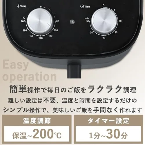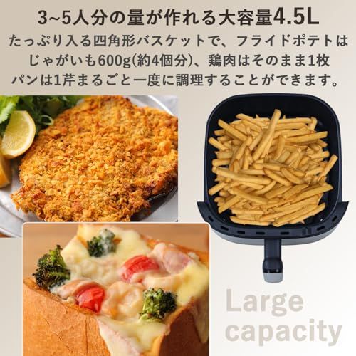 【大容量&ハイパワー】35人分の量が作れる大容量4.5Lでフライドポテトはじゃがいも600g(約4個分)、鶏肉はそのまま1枚、パンは1芹まるごと一度に調理できます。さらに1200Wハイパワーでスピーディに、熱風の循環で油を使わなくてもサクッとジューシーに仕上げます。
