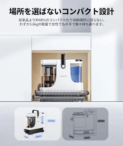 【場所を選ばないコンパクト設計】本体サイズは29x12.8x33.3cm、従来品より約48%のコンパクト化した設計で収納場所に困らなりません。ホースは本体にまとめて収納可能なので、ホースの絡まりを解消しながら省スペース保管できます。わずか3.6kgの軽量で女性でも片手で軽々と持ち運べ、外に持って出て車シートを洗浄しても苦になりません。