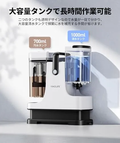 【大容量タンクで長時間作業可能】清水タンクは1000ml、汚水タンクは700mlとの大容量なので、頻繁に水を補充したり排出したりする手間が省けます。そして、2つのタンクとも透明デザインなので水量が一目で分かります。3Mの電源コードと1.7Mのホースを備え、広い範囲の掃除や、一度にまとめての掃除に便利です。