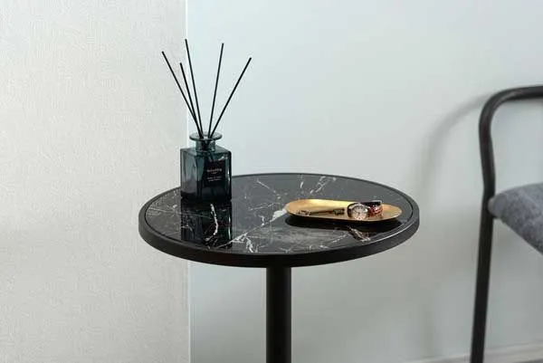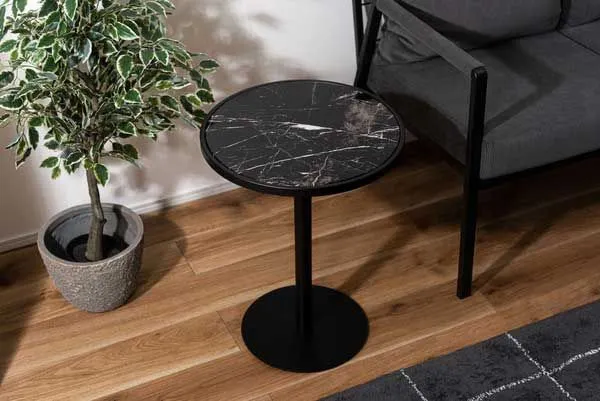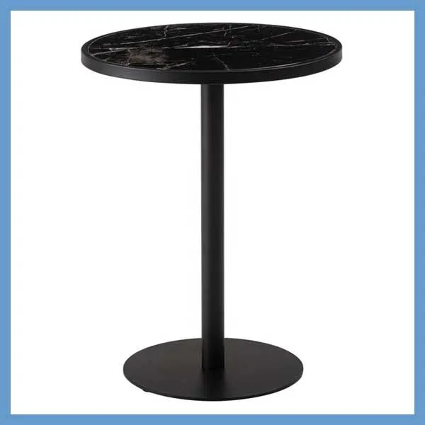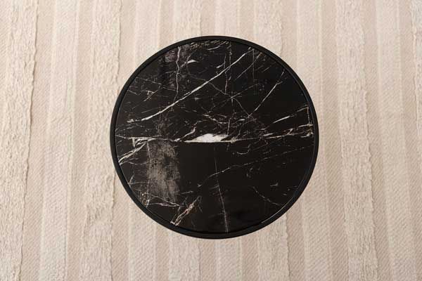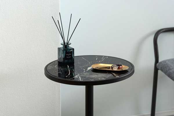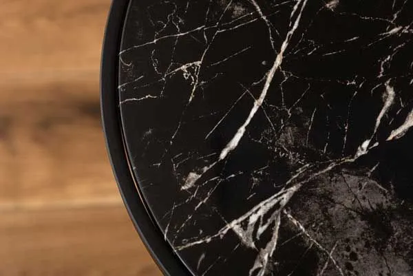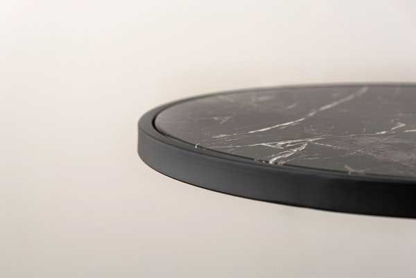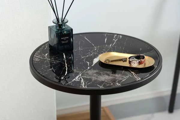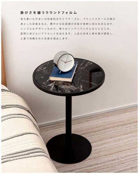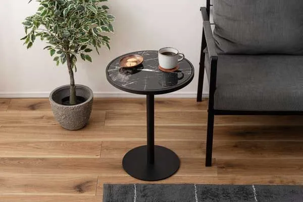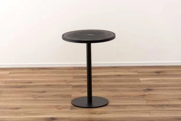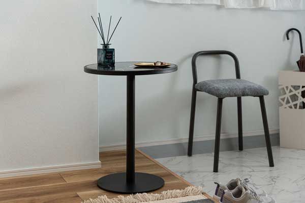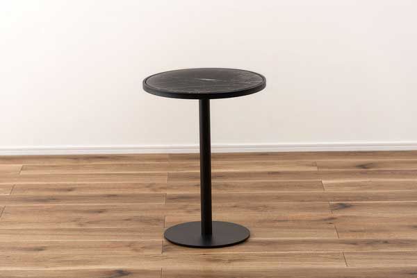 ●ブラックスチールの脚が凛とした印象を与え、艶やかな石目調の天板が空間に深みを添えます。