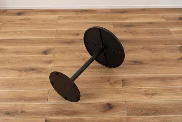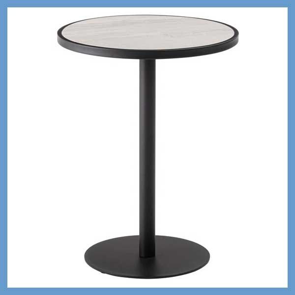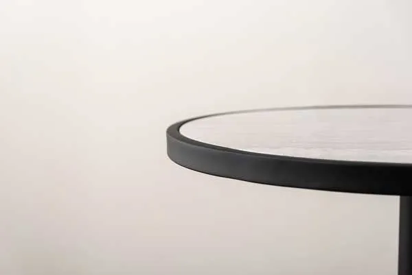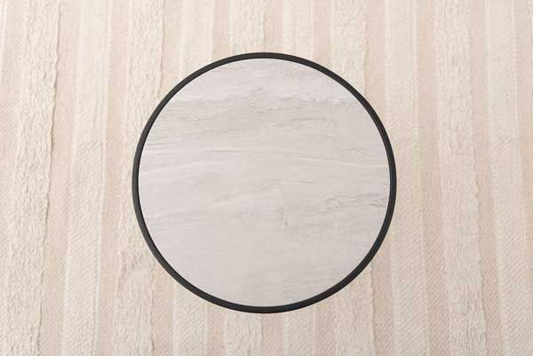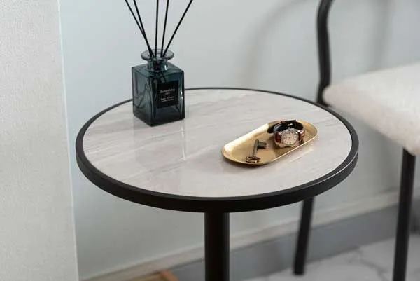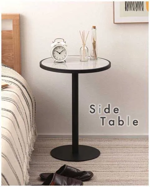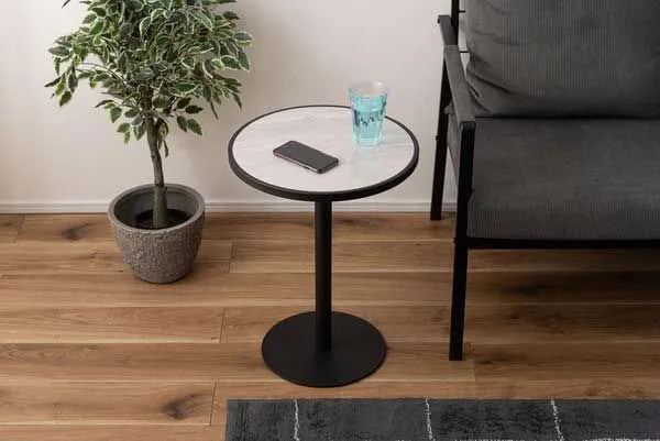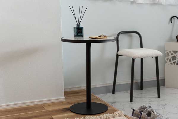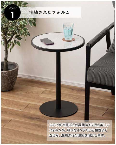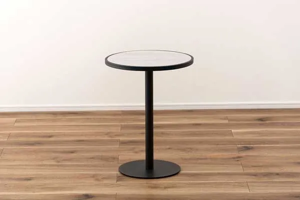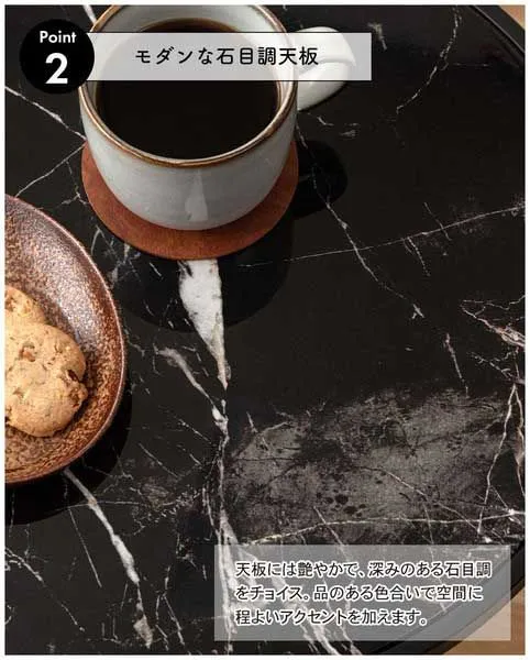●ブラックスチールの脚が凛とした印象を与え、艶やかな石目調の天板が空間に深みを添えます。