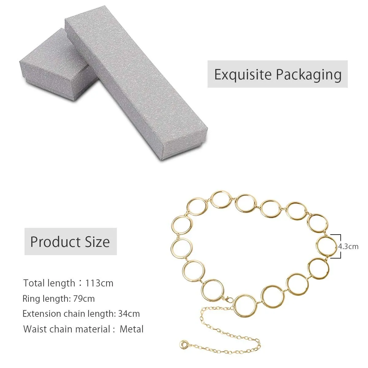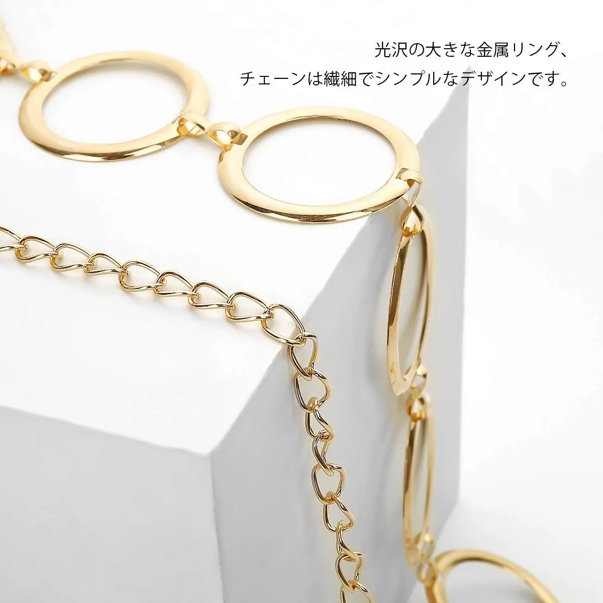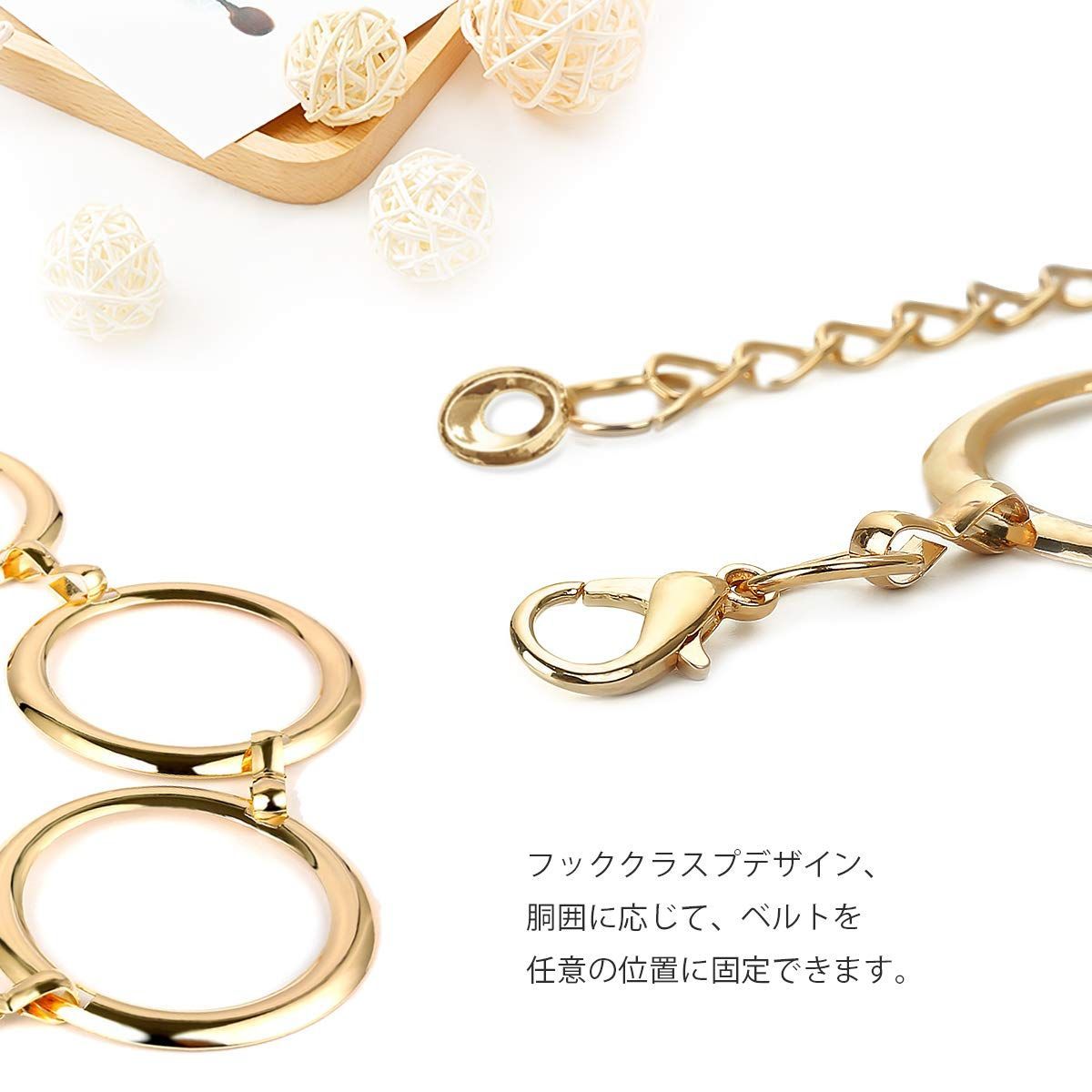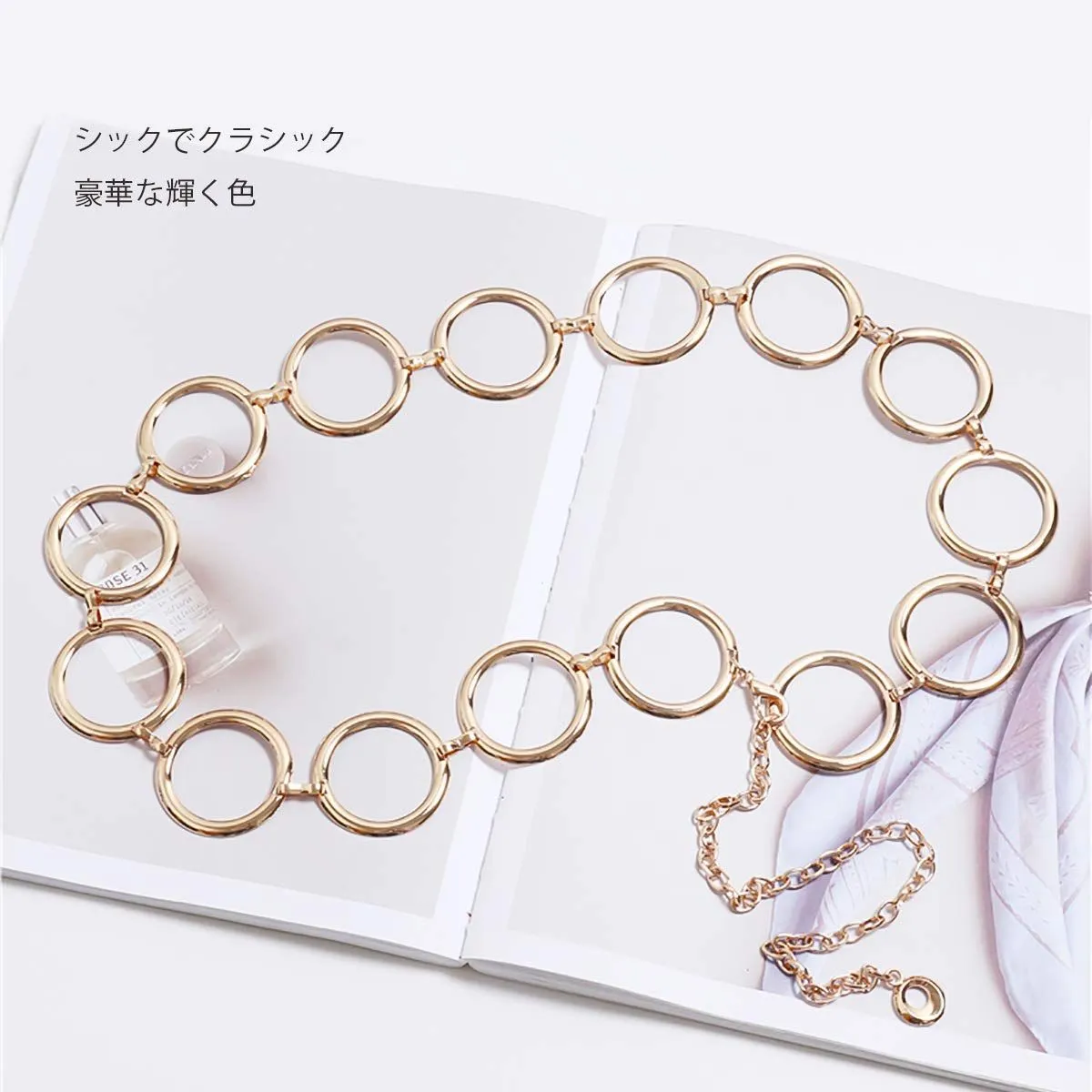 【ファッション小物】この実用的なベルトを希望の服と完全に合わせることができます。それはワードローブに不可欠な小物です。また、ボディチェーンにすることもできます。光沢のある金属チェーンが肌のトーンと良い体型を引き立てます。