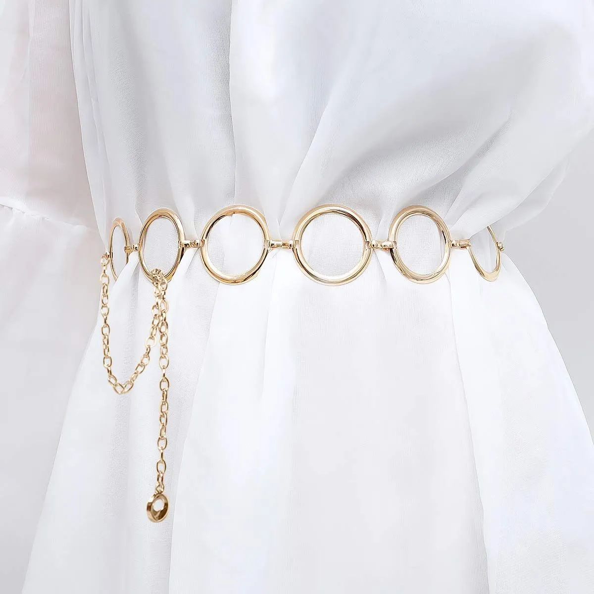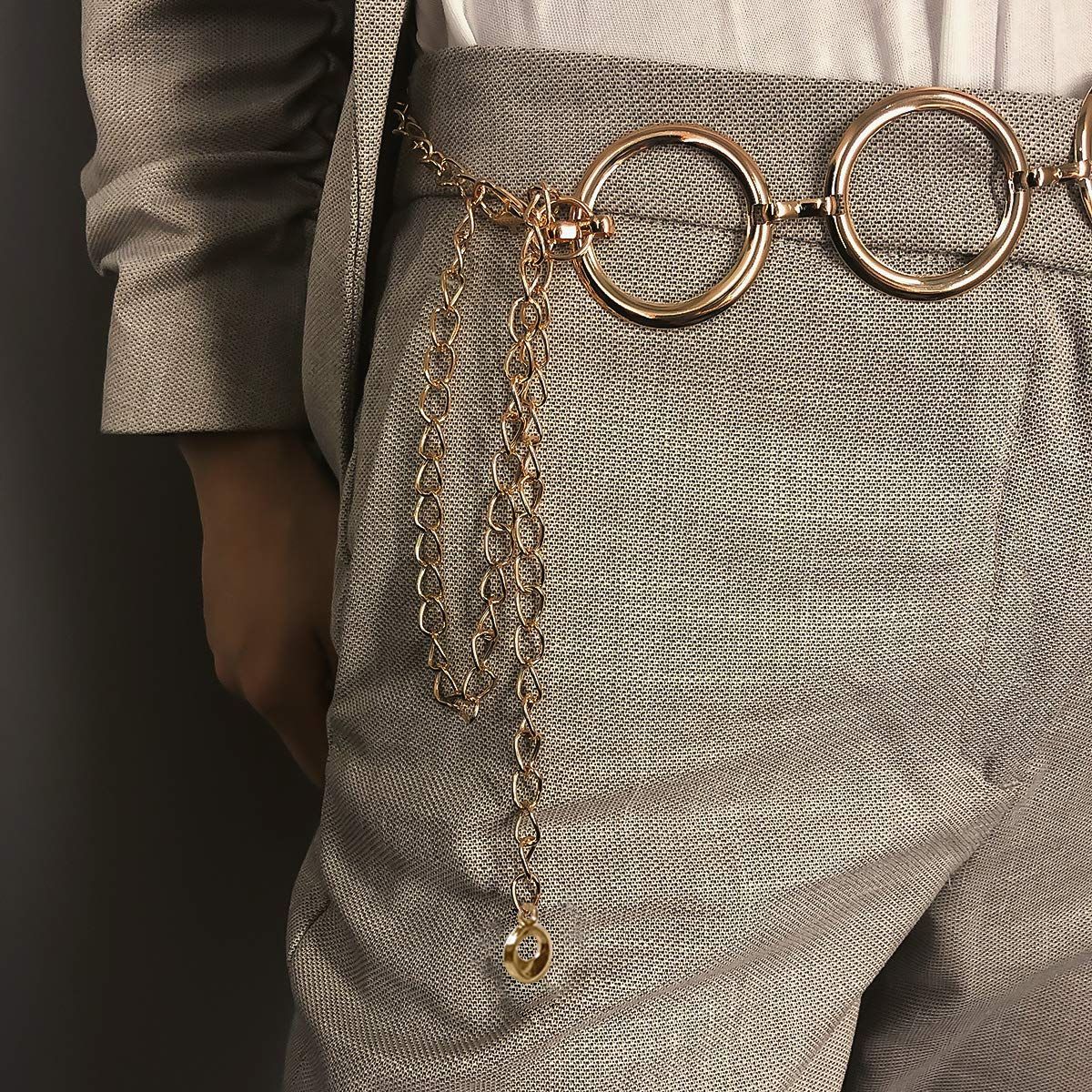 【シンプルなデザイン】光沢の大きな金属リングベルト、ラウンドペンダント付き長いチェーン、チェーンは繊細でシンプルなデザインです。金または銀のチェーンベルト、クラシックで豪華な色はあなたの服を完璧に試合します。