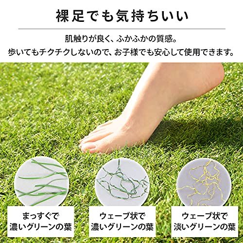 お庭やベランダなど、広い場所にも敷きやすく、継ぎ目が目立ちにくい人工芝です。 こだわりの質感で、天然芝のような触り心地。 3種類の色味と質感の異なる葉を混ぜることで、リアルな風合いと触感を再現。 カッターで簡単にカットできるので、設置場所に合わせて設置も簡単。 安心の国内生産品です。 芝刈や水やりなどめんどうなお手入れはいりません。 d6a7add9
