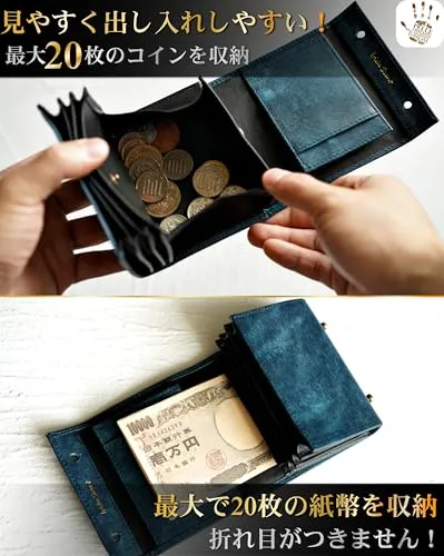 【サイズと容量】幅10.8cm / 高さ8.6cm / 厚み2.7cm。3つの大容量カードスロットと2つの便利なアクセスカードスロットを持ってい。小銭袋は箱型で硬貨を出し入れしやすいようになっています。カード15枚,コイン1520枚,紙幣20枚を収納でき