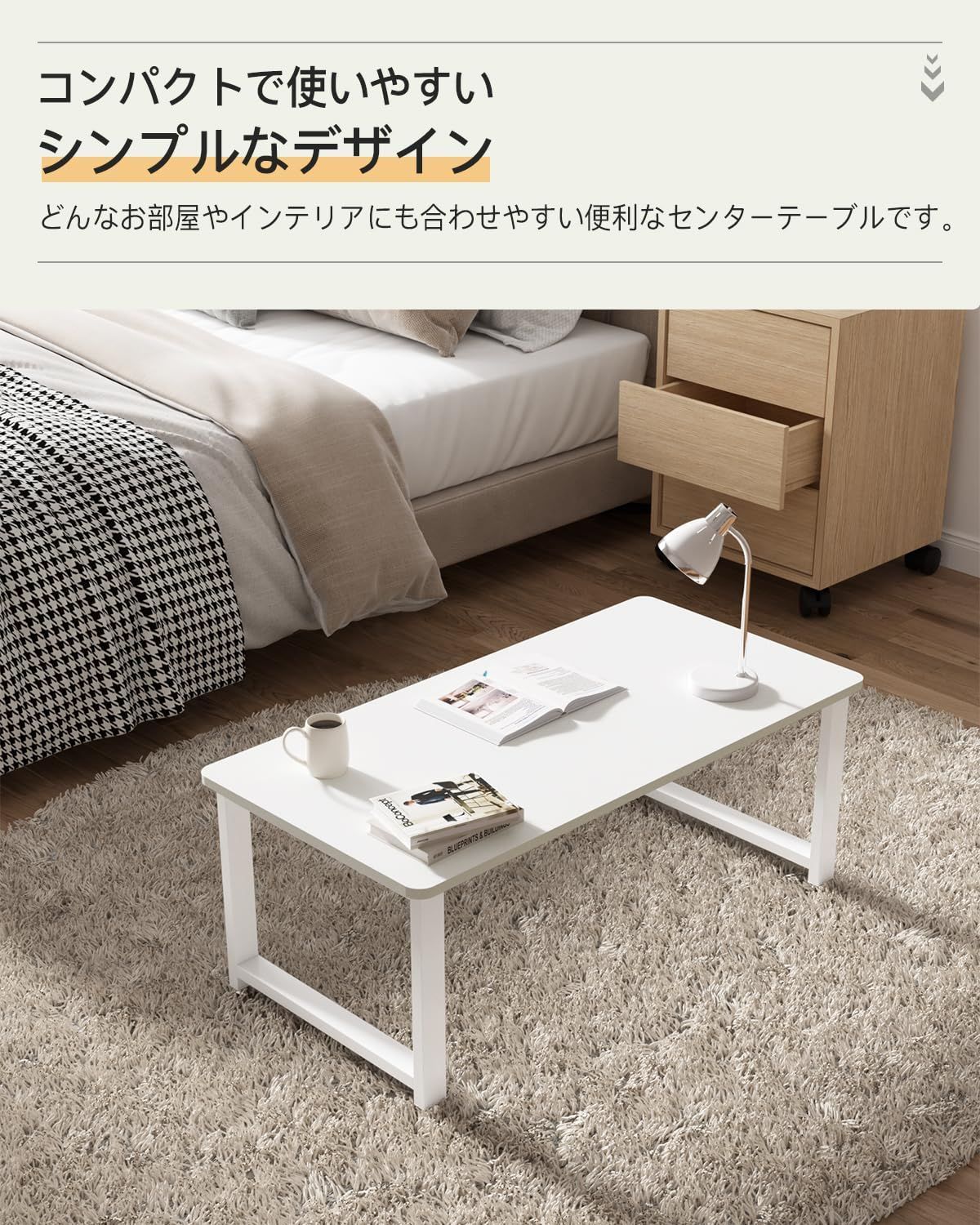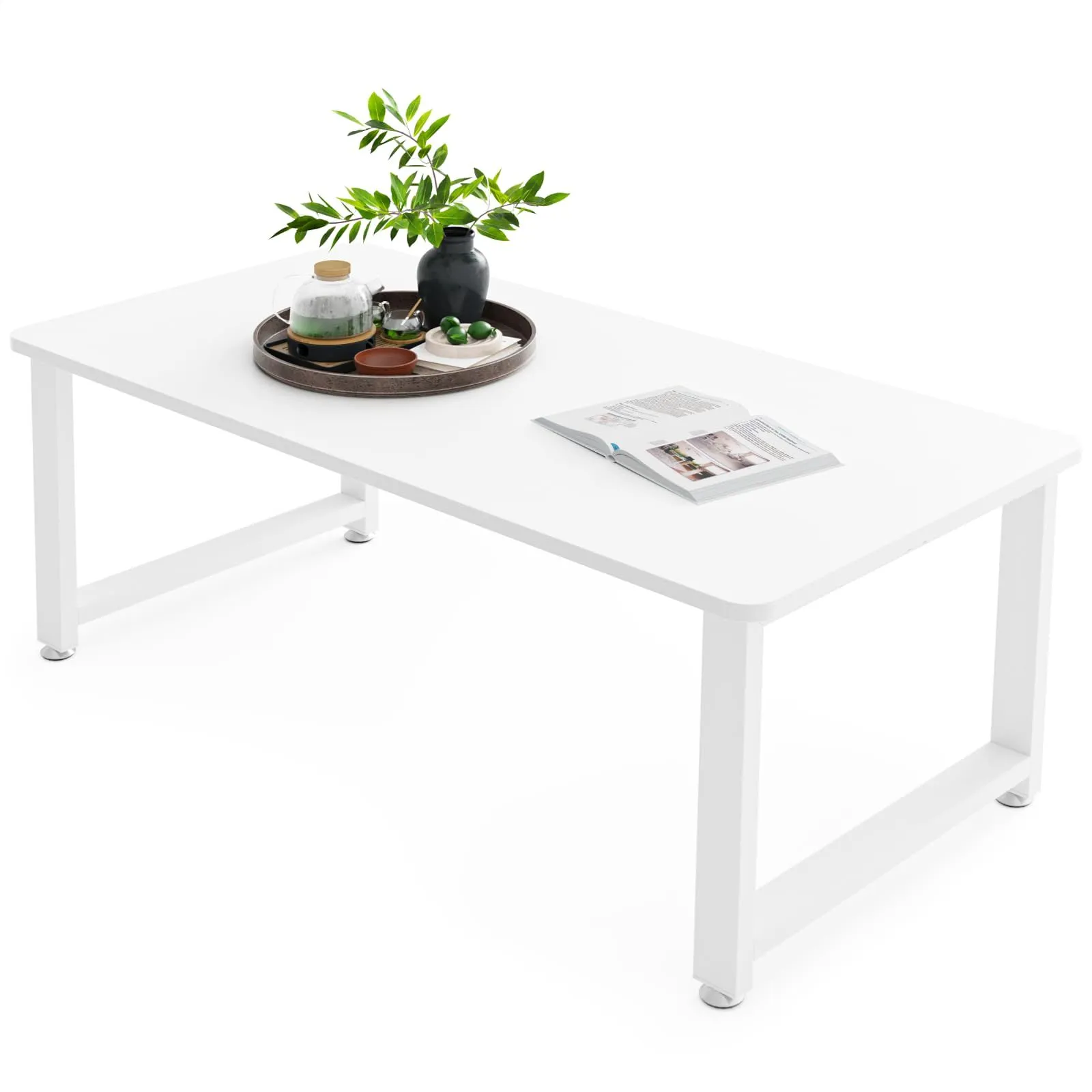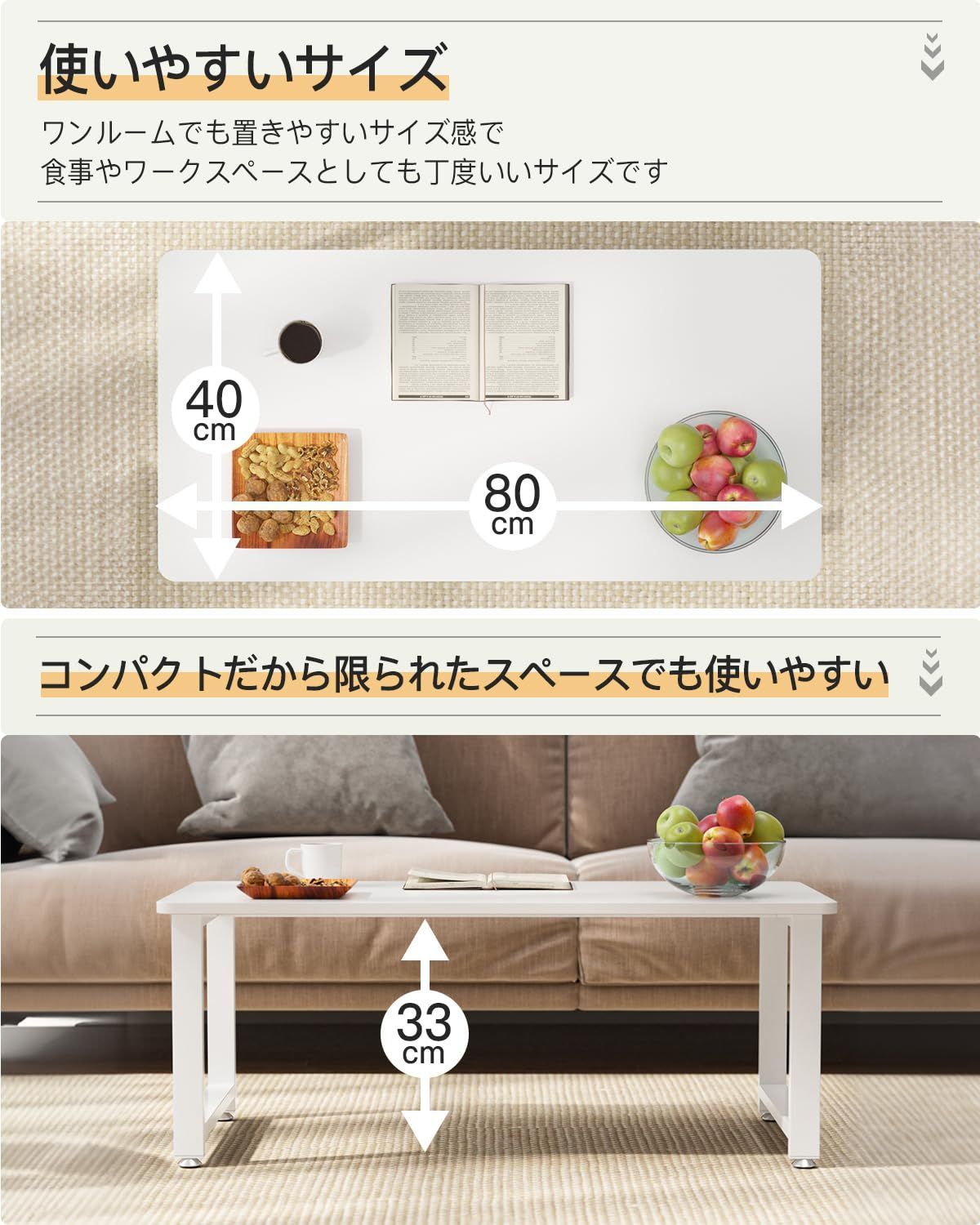 DEWEL ローテーブル 幅80×奥行40×高さ33cm センターテーブル 机 コーヒーテーブル リビング ソファテーブル スチール脚 アジャスター付き 木製 低い 和室 ロータイプ (ホワイト, 幅80cm)