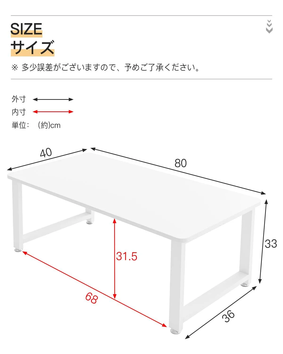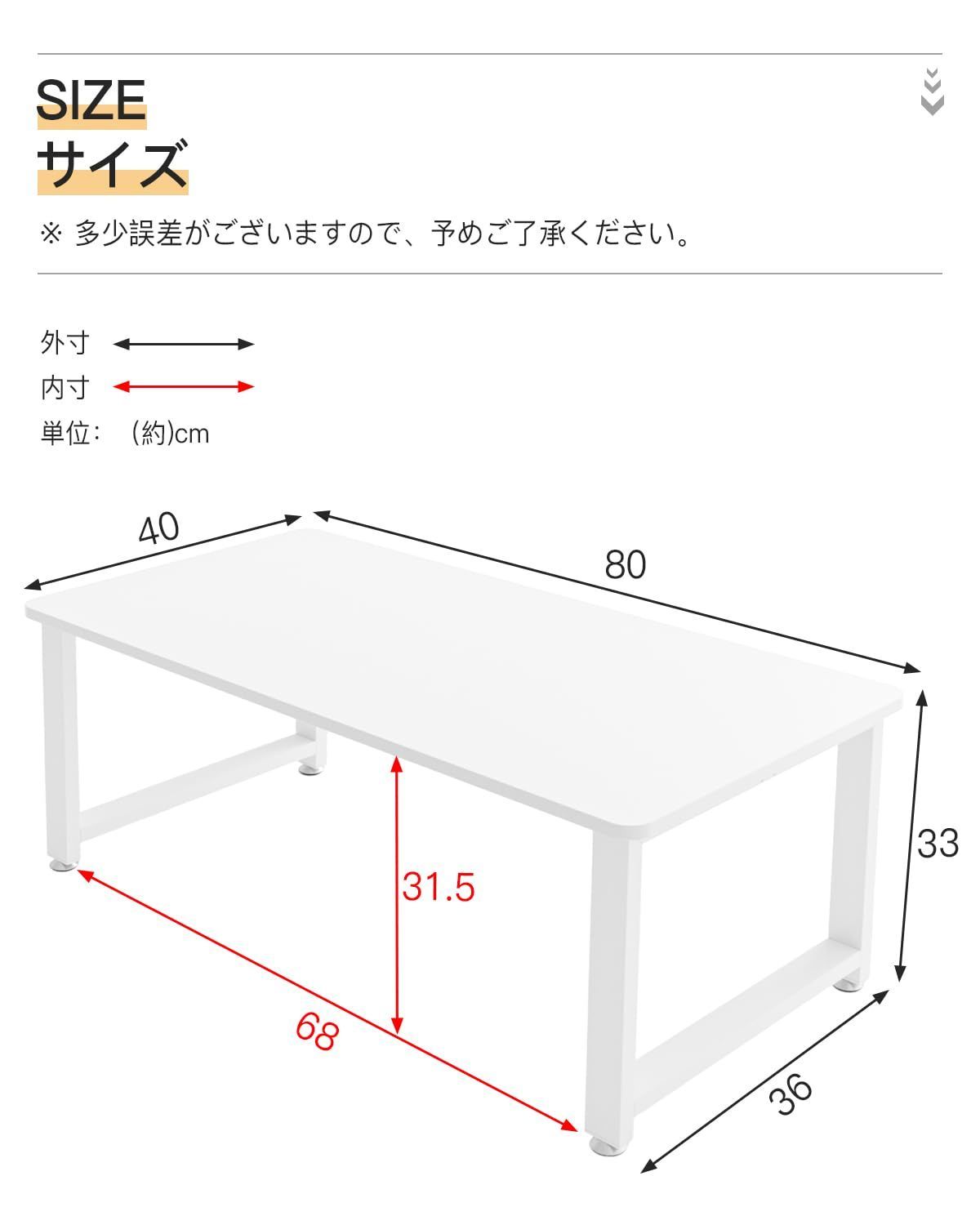 【商品詳細】 完成品サイズ:約幅80×奥行40×高さ33cm、 耐荷重:総耐荷重約35kg 、材質:天板:メラミン化粧板/ 天板中身: パーティクルボード (天板15mm厚) フレーム:スチール(粉体塗装)