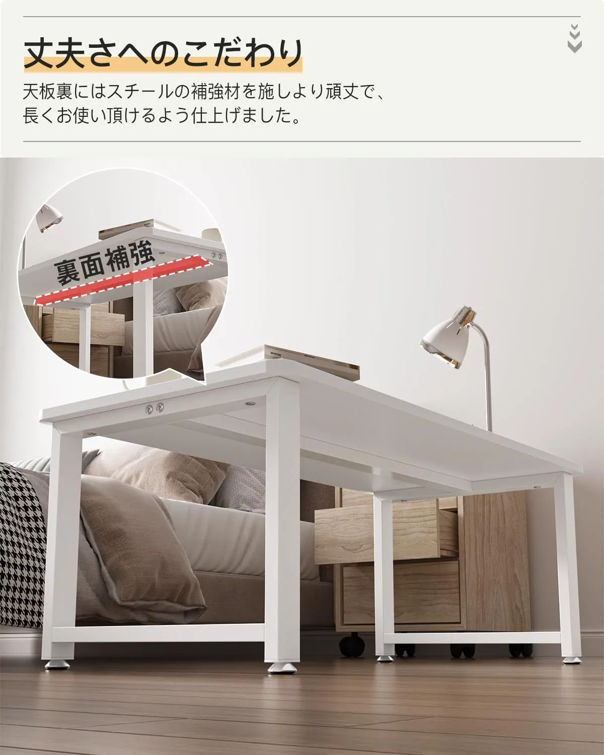 【ちょうどいい高さ約33cm】床から天板までの高さは31.5cm。足元に余裕を持たせ程よい高さに仕上がりました。ソファに座りながらでも作業が快適な高さ。お掃除もしやすいです。
