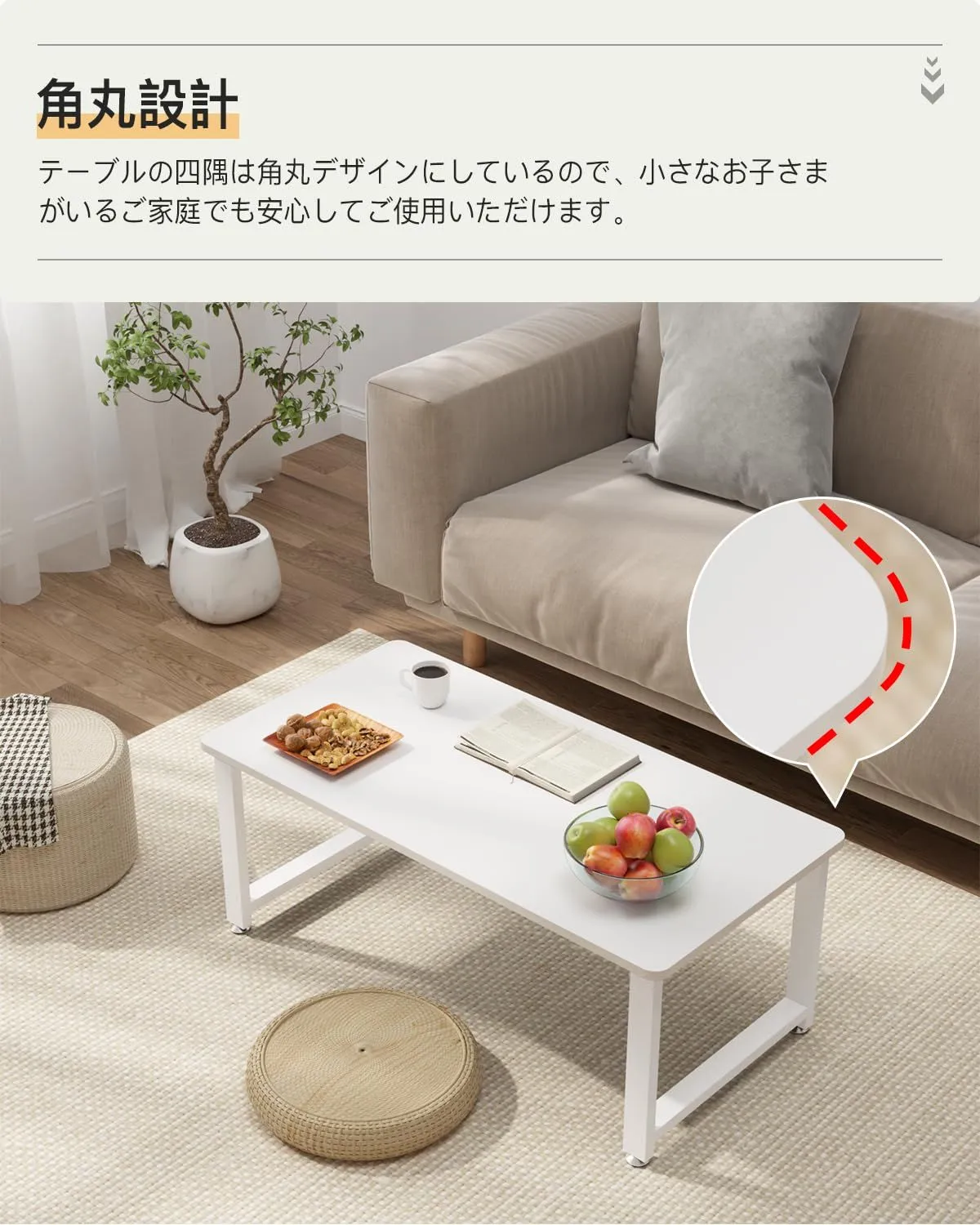 【丸角設計】角に丸みをもたせた面取り加工を施すことで、万が一、子供の頭や大人の肘などを打ってしまうと大きな怪我になりかねません。