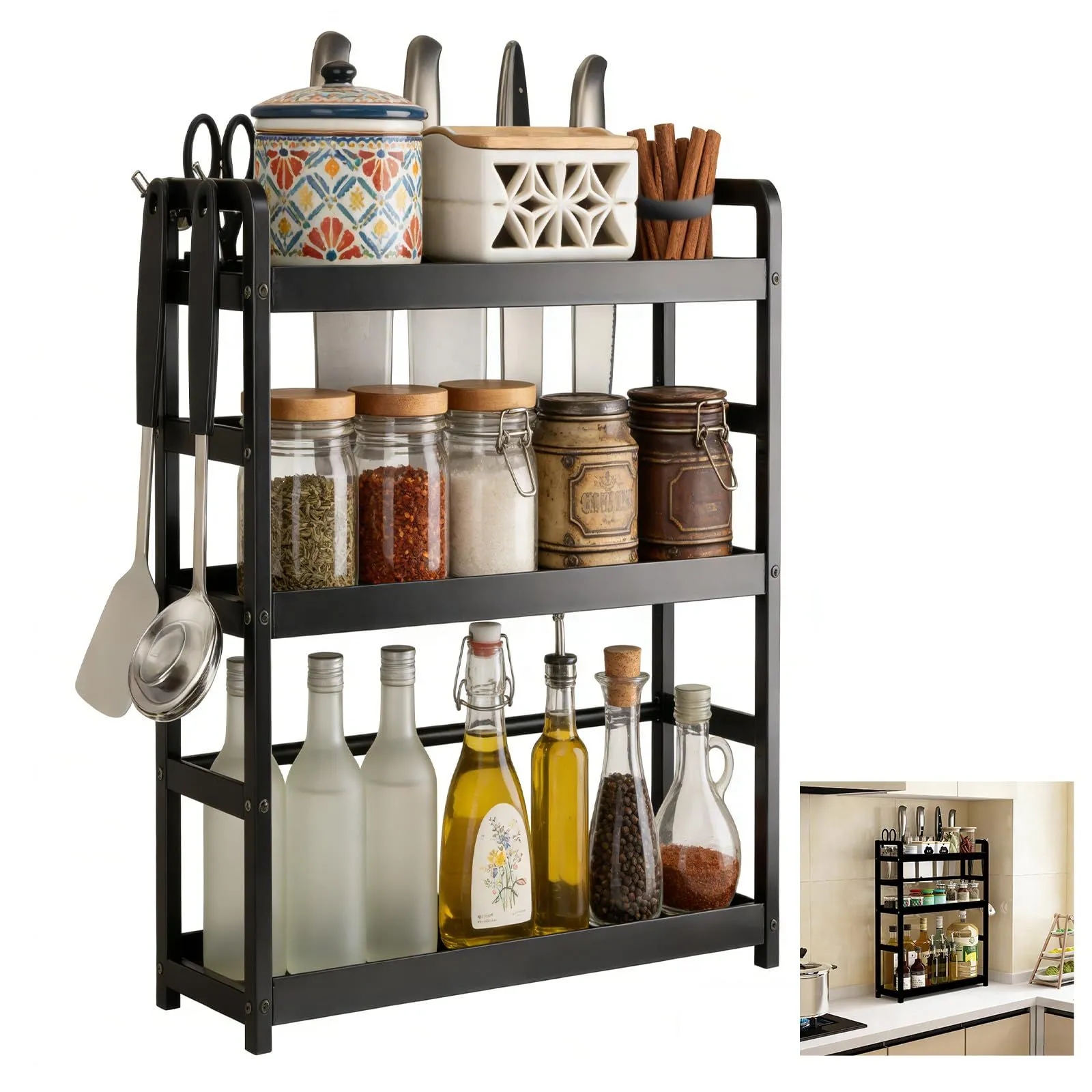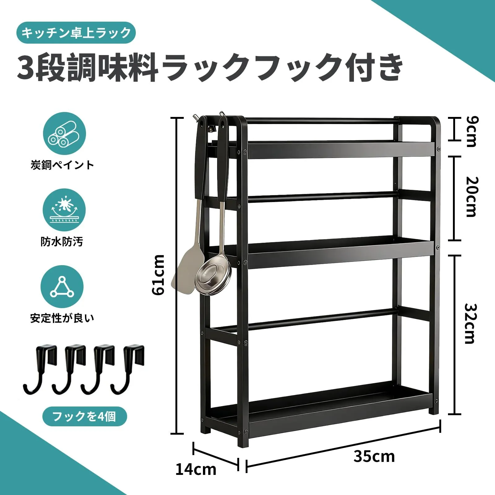 調味料ラック 3段 収納ラック フック付き キッチンテーブルスタンド 大容量 組み立て簡単 多機能 炭素鋼製 省スペース 防水 簡単お手入れ 水切りラック キッチン収納 香辛料ラック ブラック 日本語説明書付き