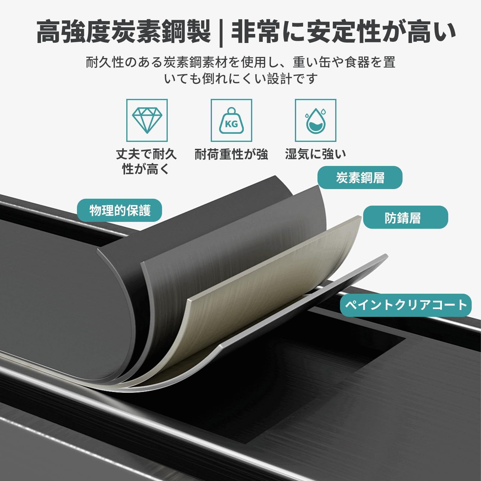 ?? 高強度カーボンスチールで安定感抜群:丈夫な炭素鋼を使用しているため、重い瓶や調理道具を入れても倒れる心配がありません。耐久性に優れ、キッチンの高温多湿な環境でも錆にくく長持ちします。汚れも拭き取れるので清潔を保てます。