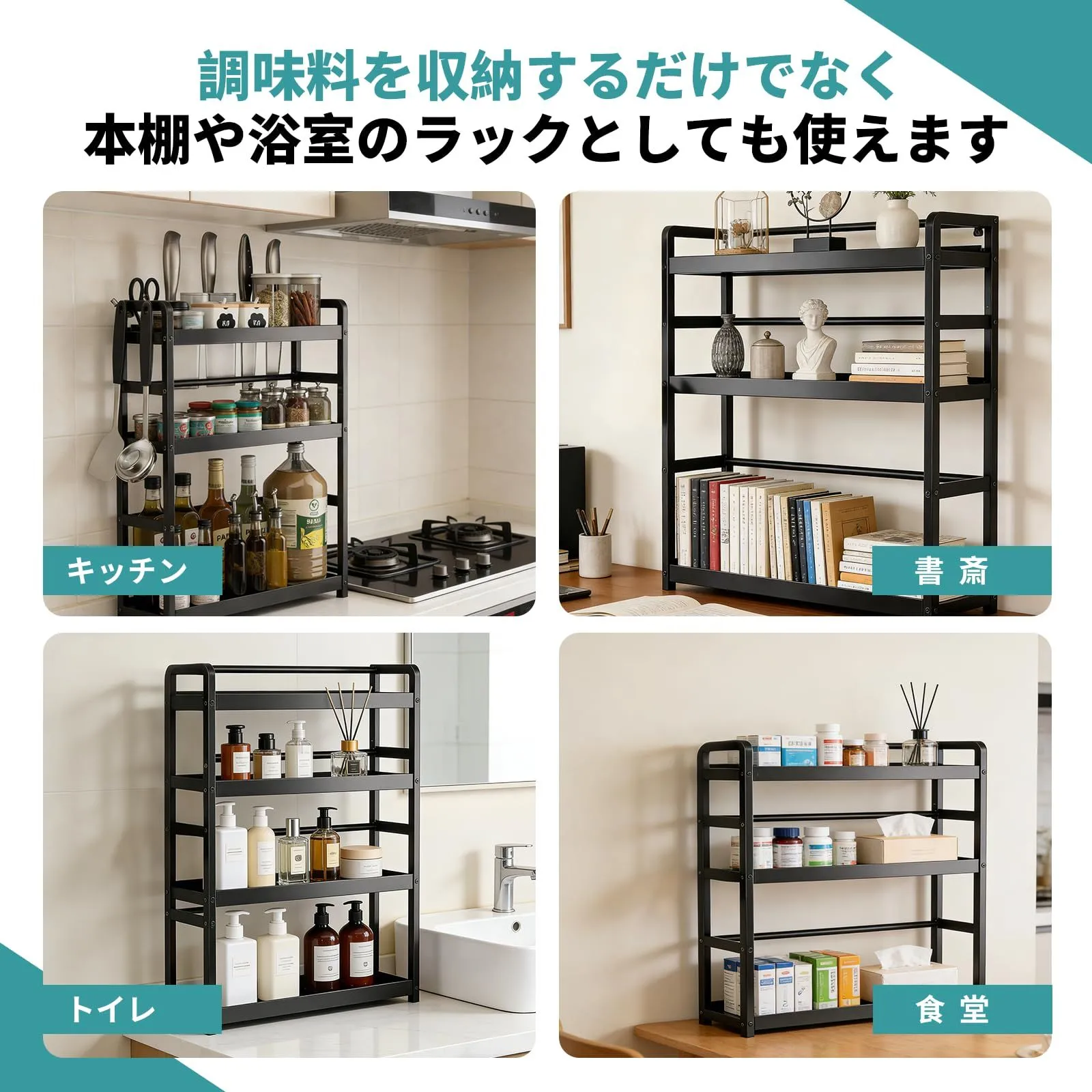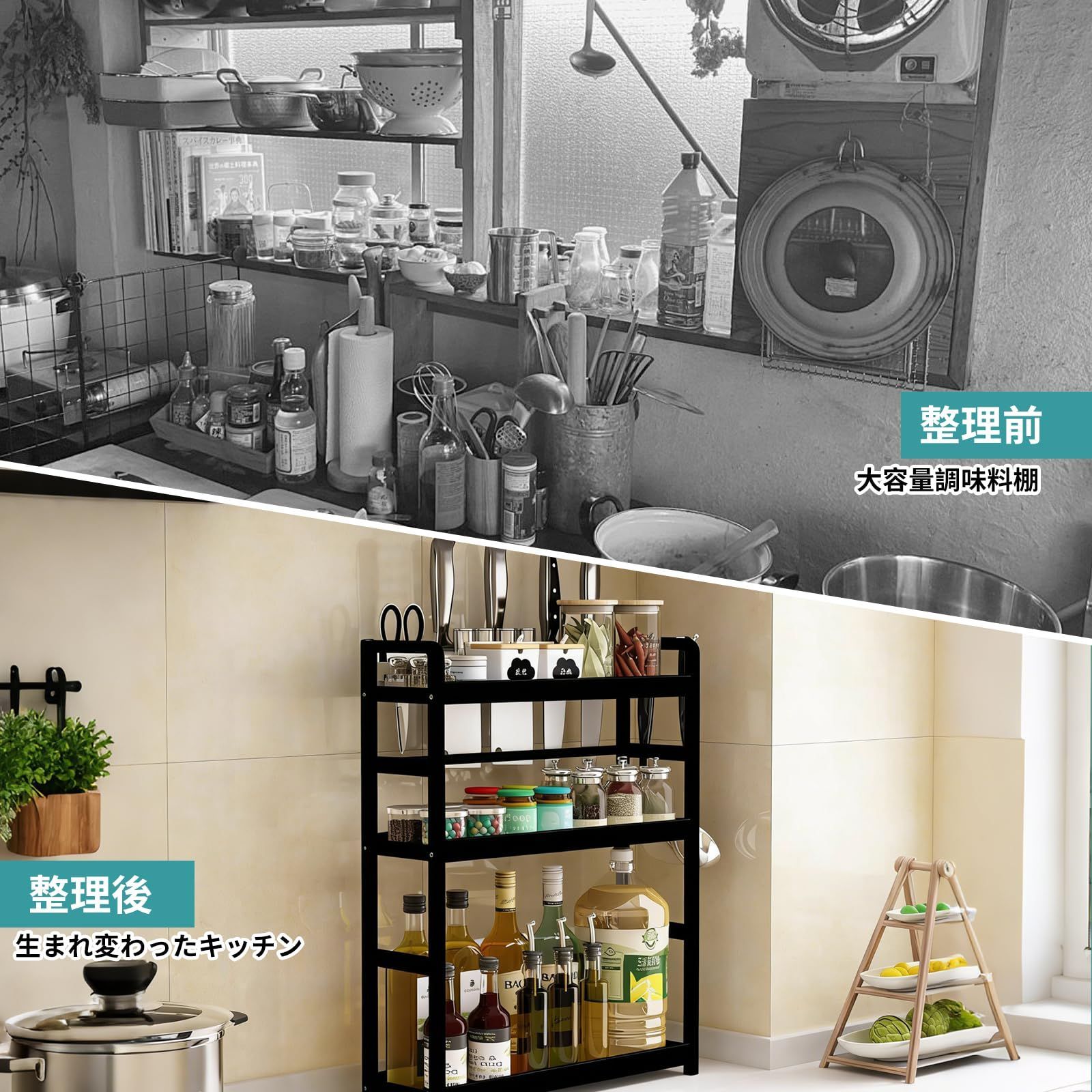 ?? オールマイティーな使い心地:調味料収納だけでなく、本棚やバスルームの収納棚としても活用可能。インテリアに溶け込むシンプルなデザインで、家中の色々な場所で活躍します。1つあると収納の幅が広がる便利アイテムです。