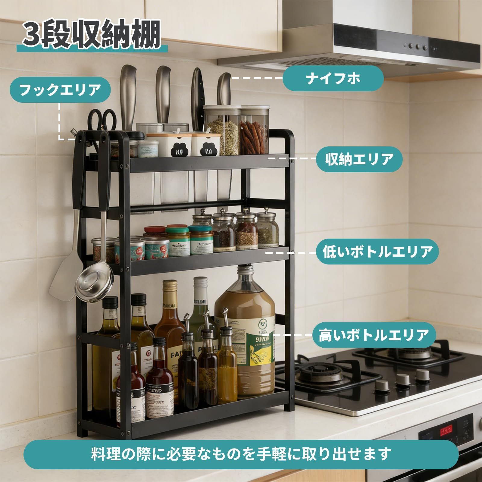 ?? 3段収納で調味料と調理道具をまとめて収納:奥行きのある3段構造で、調味料瓶やスパイス、調理器具などを種類別に整理収納。専用の包丁スタンドとフック付きで、キッチン道具を1ヶ所にまとめられます。調理中でも必要なものがすぐ手に取れる便利さです。