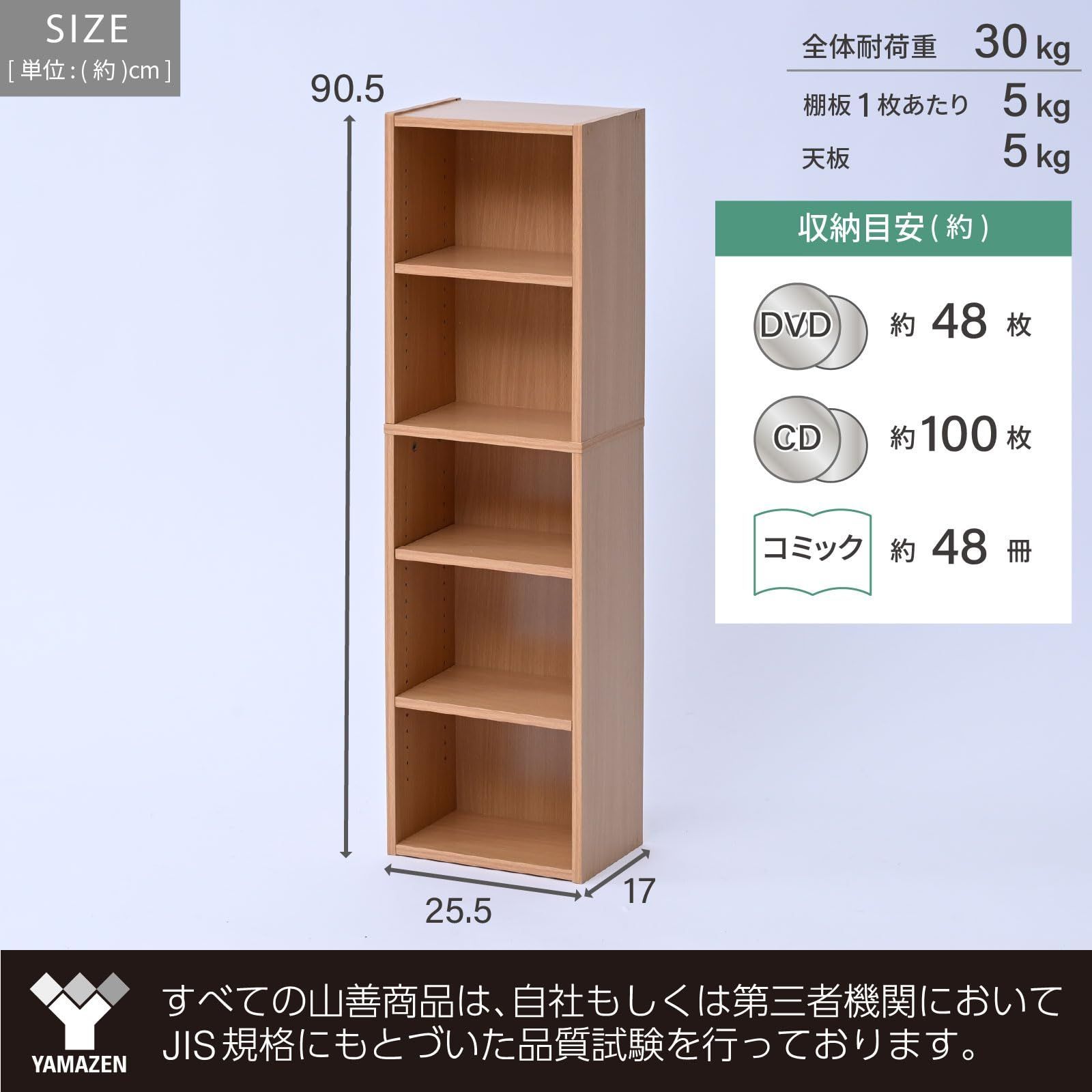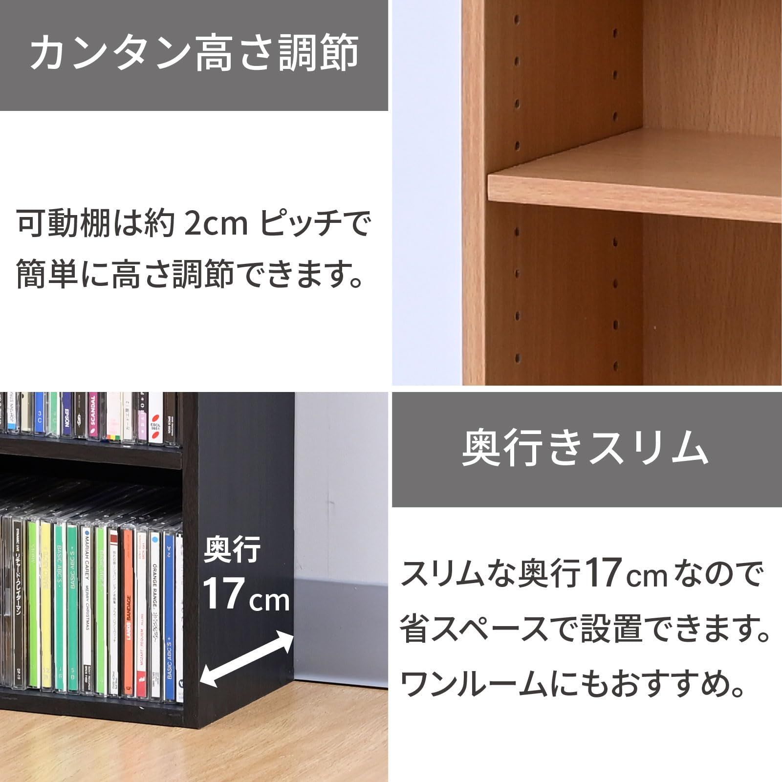 ●収納目安(約) : DVD48枚、CD100枚、コミック48冊(背幅をDVD14mm、CD11mm、コミック15mmで計算した場合)
