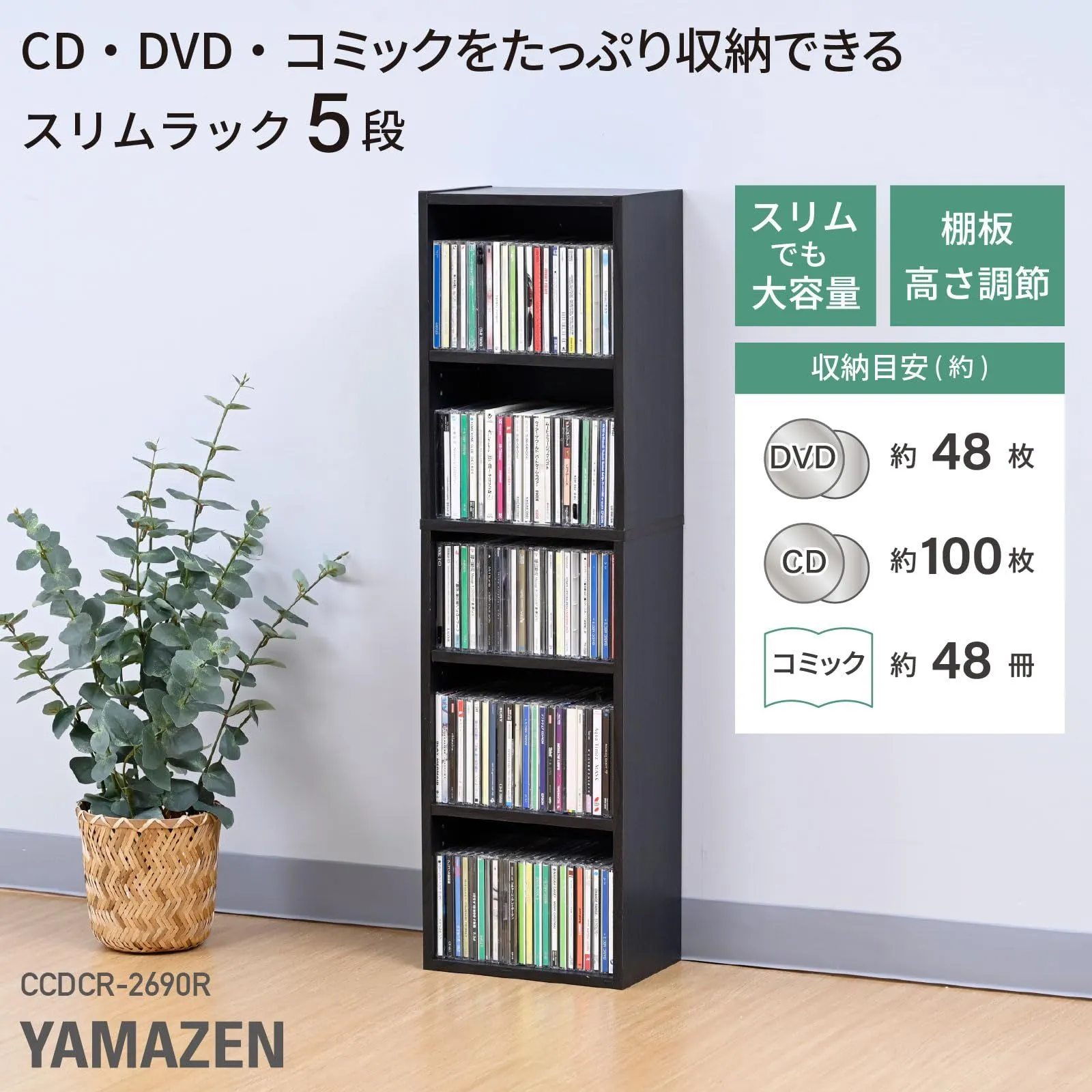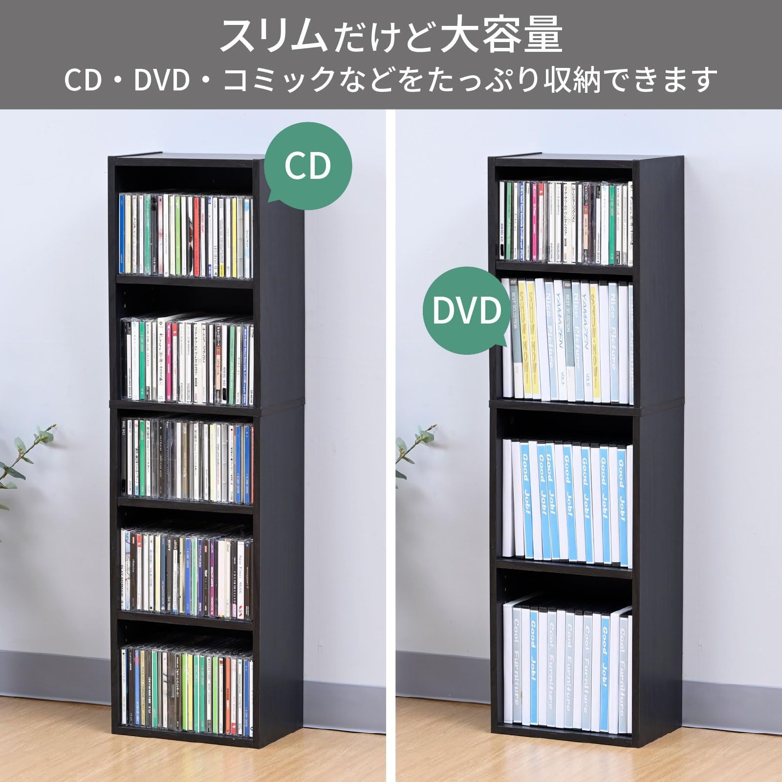 【スリムだけど大容量】スリムなのにたっぷり収納できます。収納目安(約) : DVD48枚、CD100枚、コミック48冊(背幅をDVD14mm、CD11mm、コミック15mmで計算した場合)