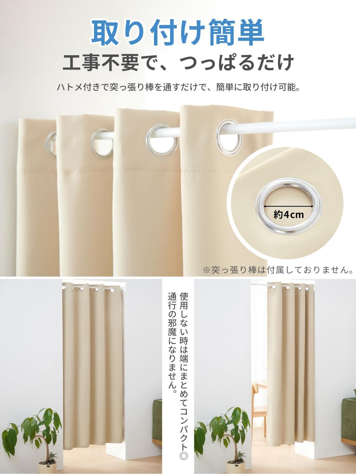 【取付簡単・多用途】ハトメ付きで突っ張り棒を通すだけで簡単に取り付け可能。フックやネジ穴は不要で、開け閉めの横滑りがスムーズに動かせます。使用しない時は端にまとめてコンパクト◎、通行の邪魔になりません。玄関や廊下、階段、キッチン、リビング、ベッドルーム、洗面所、押入れなど、さまざまなシーンや場所で活用できます。