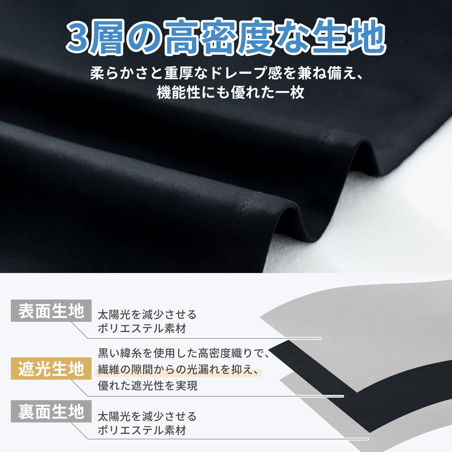 【1級遮光・目隠し】無地のカラーバリエーションに加え、遮光1級の高機能カーテン生地を使用し、99.99%の遮光効果を実現。外光をほとんど遮断し、透け感を抑えたロングタイプで、スッキリとした目隠し効果を発揮します。昼夜問わずぐっすり眠りたい寝室はもちろん、リビングや1人暮らしの部屋などプライバシー重視の空間にも最適。目線が気になる場所や収納を隠すのにも便利です。※一級遮光は光を完全に遮るものではありません。光漏れを気にされる方は遮光効果の高い濃色がおすすめです。