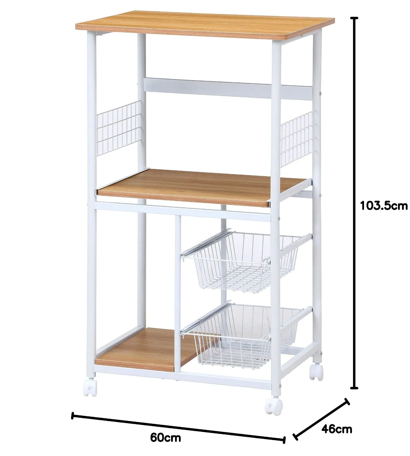 不二貿易 キッチンワゴン キャスター付き キッチンラック レンジ台 一人暮らし スライド棚 引き出し収納 バスケット付き 幅60×奥行46×高さ103.5cm ホワイト ナチュラル 15422
