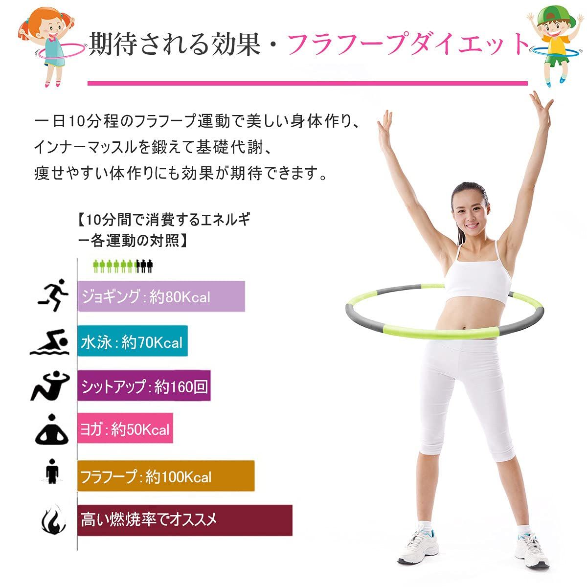 【効率よくカロリー消費】ウエストまわりのインナーマッスルを鍛えて、きれいなくびれがつくれると注目のフラフープエクササイズ。メタボ対策にもなり、体幹の筋肉を引き締めて美しい姿勢を保つこともできます。10分のフラフープの運動を行えば、ウォーキングを25分したのと同等のカロリー消費量です。便秘解消、骨盤矯正、引き締め効果や体力向上も期待出来ます。