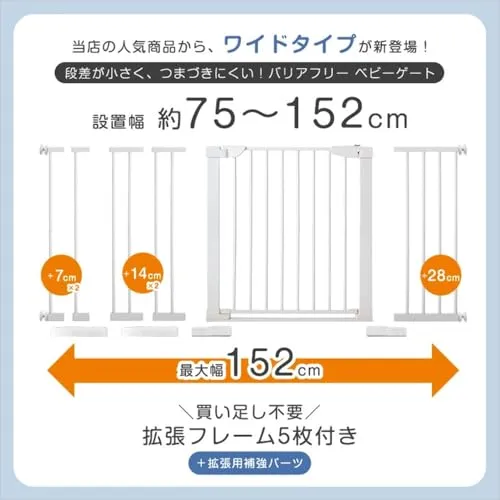 【スタッフのおすすめポイント】・設置幅75152cmまで広く対応! ・細かな調整が可能な拡張タイプ ・段差が小さく、つまづきにくいバリアフリー ・壁に穴をあけない突っ張り式 ・閉じ忘れ防止!オートクローズ ・110度以上で静止できる扉解放機能 ・前後どちらにも開閉OK ・片手で簡単にロック解除 ・安心安全のダブルロック ・なめても安心!塗装試験クリア