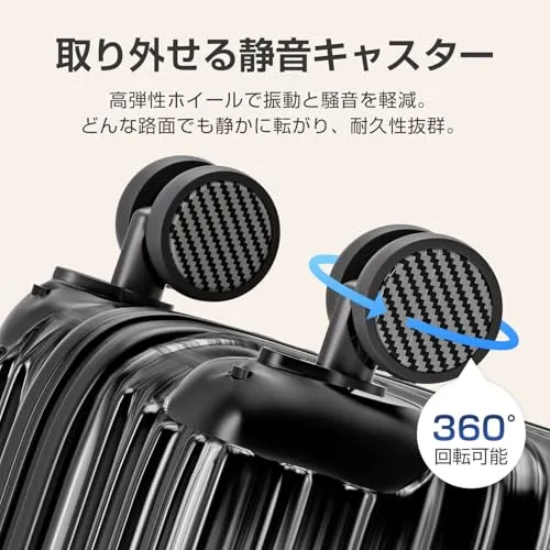 【360回転静音キャスター&着脱式設計】スムーズな移動を実現する静音ダブルキャスターは、360自在に回転し、混雑した空港内や狭い通路でもストレスなく操作できます。キャスター部分は取り外しが可能なため、交換・メンテナンスもしやすく、長く愛用できるキャリーケースです。