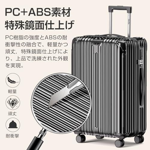 【軽量PCABS素材&使いやすい内装】 軽量かつ耐久性に優れたPCABS素材を採用し、長時間の持ち運びや海外出張でも負担を軽減。内部には仕切りやポケットがあり、小物も整理整頓しやすく、X型ベルトで衣類の崩れも防止します。コンパクトながら機能的な構造で、より快適な旅をサポートします。