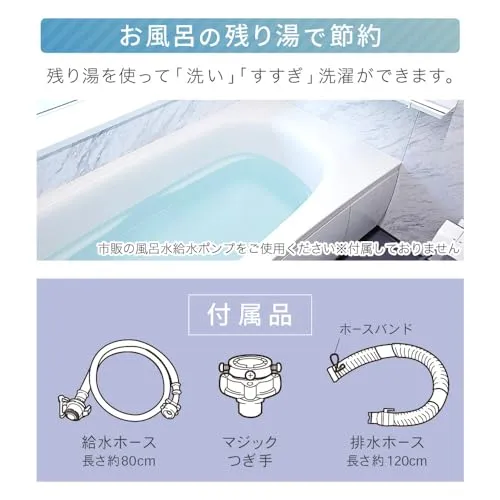 【水位調整&省エネ設計】 4段階の水位設定(45L/37L/27L/16L)から選べるため、洗濯物の量に合わせて節水可能。 うず巻式洗浄で効率よく汚れを落とし、省エネ運転を実現します。 給水ホースが付属しており、届いてすぐに使用できます。