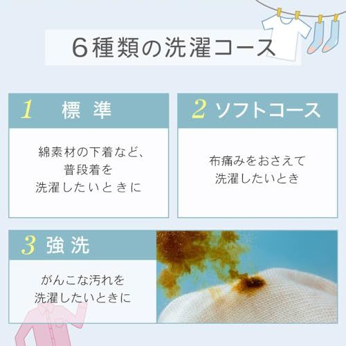 【6種類の洗濯コースを搭載】 標準・ソフト・強洗・毛布・風乾燥・自分流(または急速洗い)と、目的に合わせて使い分けが可能。 綿素材の普段着からがんこな汚れ、毛布まで幅広く対応します。 風乾燥コースは脱水槽の回転で水分を飛ばし、部屋干し時間を短縮します。