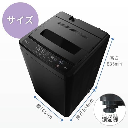 【コンパクトで設置しやすい全自動洗濯機(5kg)】 一人暮らしや二人暮らしにぴったりな5kg容量の全自動洗濯機。 幅565奥行534高さ835mmの省スペース設計で、限られたスペースにもすっきり設置できます。 お風呂の残り湯も使用でき、節水にも対応しています。