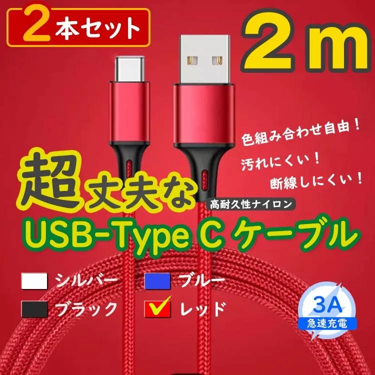 2本赤 2m タイプCケーブル android 充電器 TypeC iPhone15